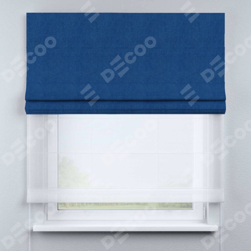 Римская штора день-ночь производителя «Cortin», используется для проёма, пошита из двух полотен, с лицевой стороны вельвет синий артикул 85554, вторая ткань тюль (по стандарту комплектуется тюль белого цвета артикул V-01). Имеет универсальный механизм и подходит для монтажа: на потолок, на стену и в нишу.