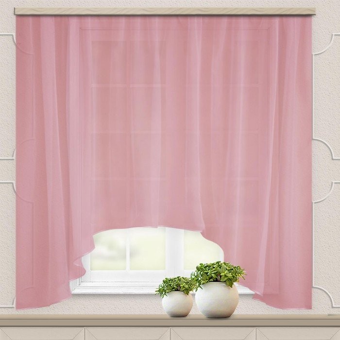 Штора для кухни входит в число самых популярных моделей занавесок благодаря простому и сдержанному стилю. Изделие изготавливают в форме арки: края располагаются ниже середины. Ширина — 285 см, высота — 160 см, высота взъёма — 52 см.