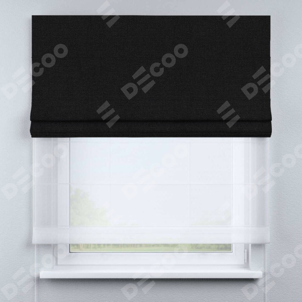 Римская штора день-ночь производителя «Cortin», используется для проёма, пошита из двух полотен, с лицевой стороны лён чёрный артикул 85927, вторая ткань тюль (по стандарту комплектуется тюль белого цвета артикул V-01). Имеет универсальный механизм и подходит для монтажа: на потолок, на стену и в нишу.