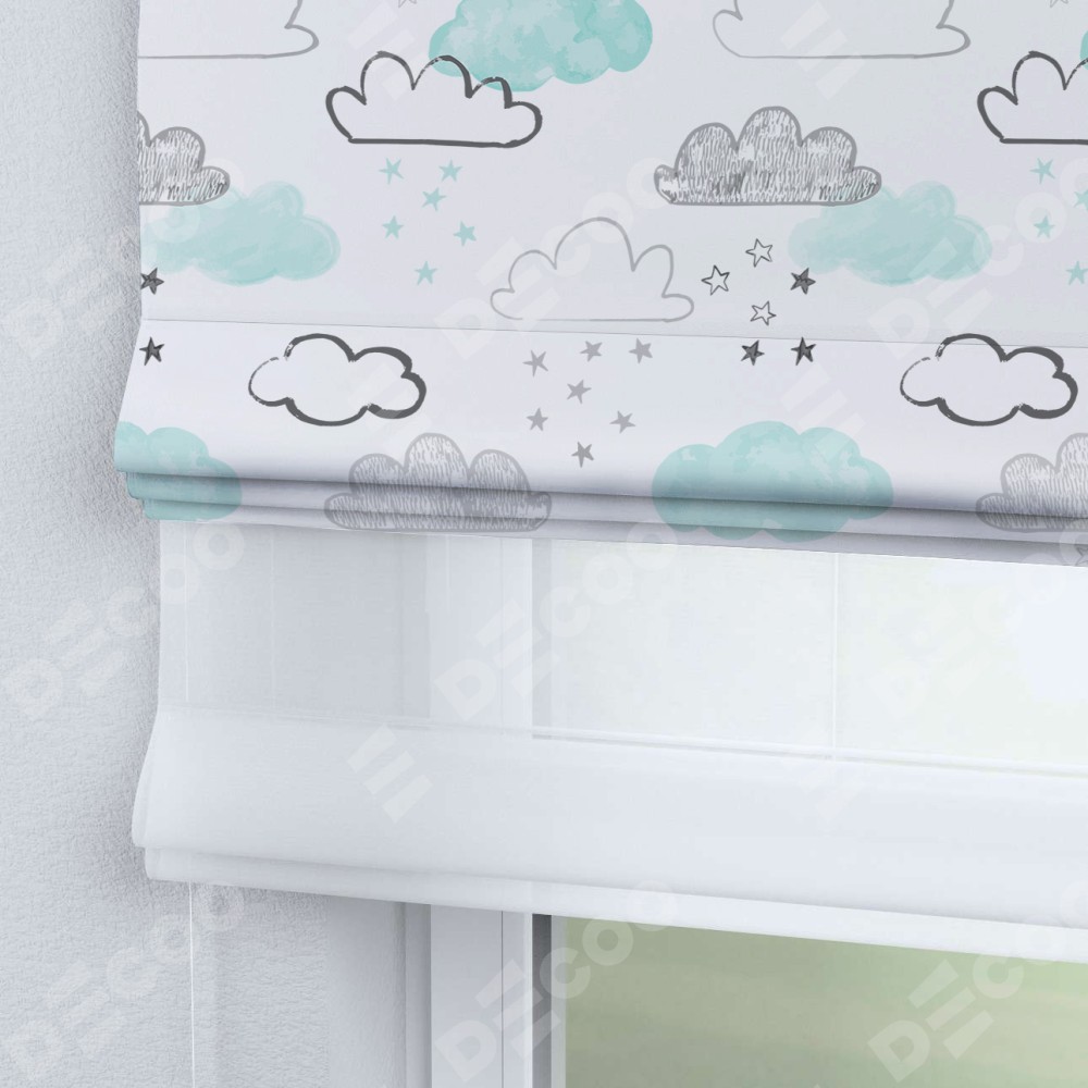 Римская штора день-ночь производителя «Cortin», используется для проёма, пошита из двух полотен, с лицевой блэкаут с нанесением сублимационной печати «Облака и звёзды», вторая ткань тюль (по стандарту комплектуется тюль белого цвета артикул V-01). Имеет универсальный механизм и подходит для монтажа: на потолок, на стену и в нишу.