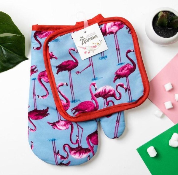 Кухонный набор (2 предмета) Доляна «Фламинго», цвет голубой, прихватка 16×16 см, рукавица 26×16 см, 100% п/э