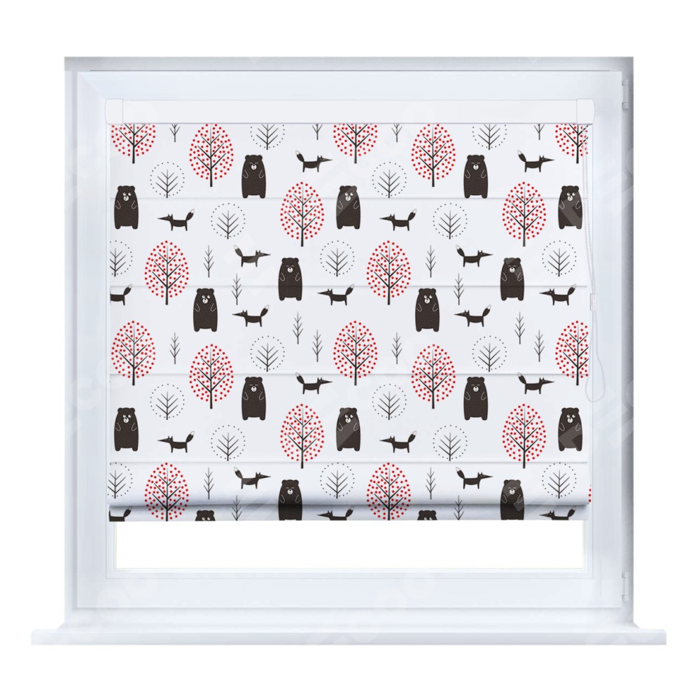 Римская штора кассетного типа, производителя «Cortin», устанавливается только на пластиковые окна и прилегает к стеклопакету, пошита из ткани блэкаут с нанесением сублимационной печати «Сканди лес».