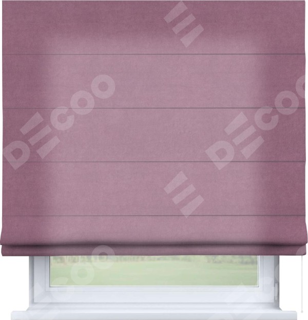 Римская штора производителя «Cortin», используется для проёма, пошита из ткани вельвет лиловый, артикул ткани 17752. Имеет универсальный механизм и подходит для монтажа: на потолок, на стену и в нишу.