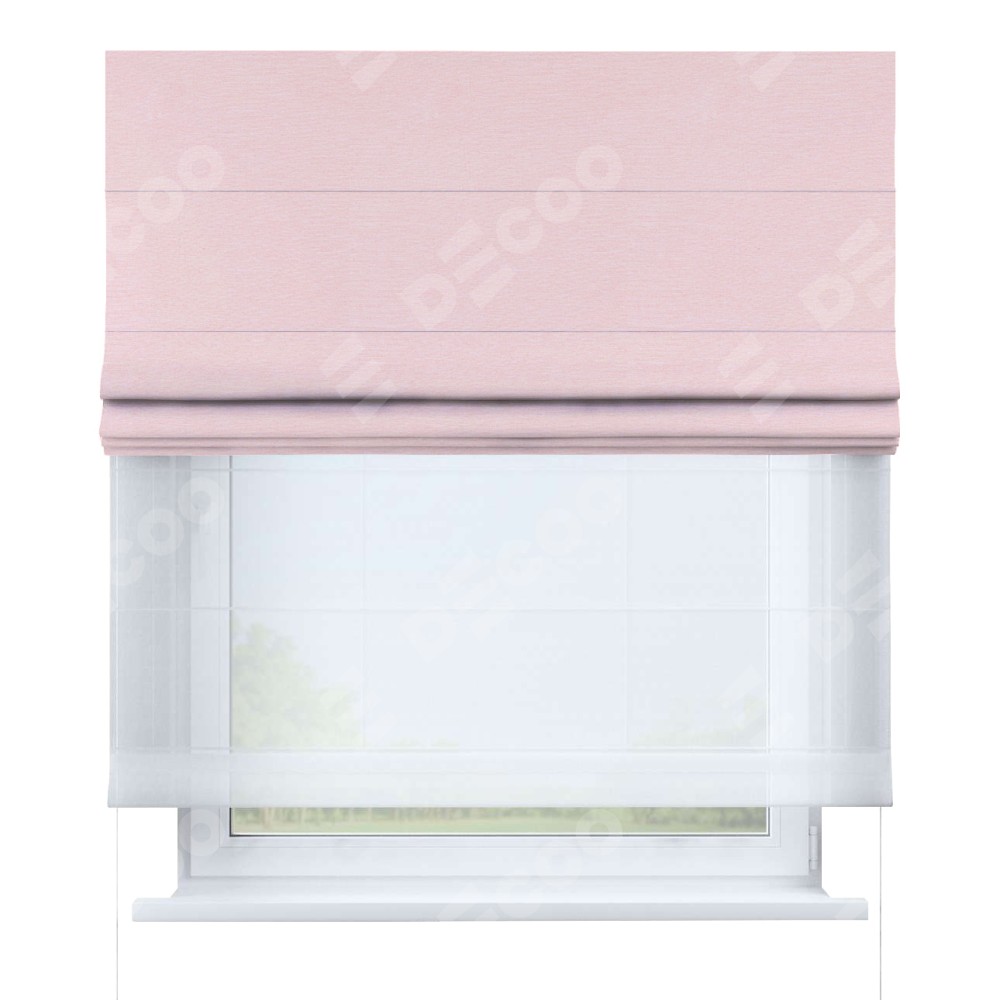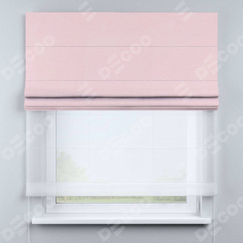 Римская штора день-ночь производителя «Cortin», используется для проёма, пошита из двух полотен, с лицевой стороны блэкаут однотонный розовый артикул 83046, вторая ткань тюль (по стандарту комплектуется тюль белого цвета артикул V-01). Имеет универсальный механизм и подходит для монтажа: на потолок, на стену и в нишу.