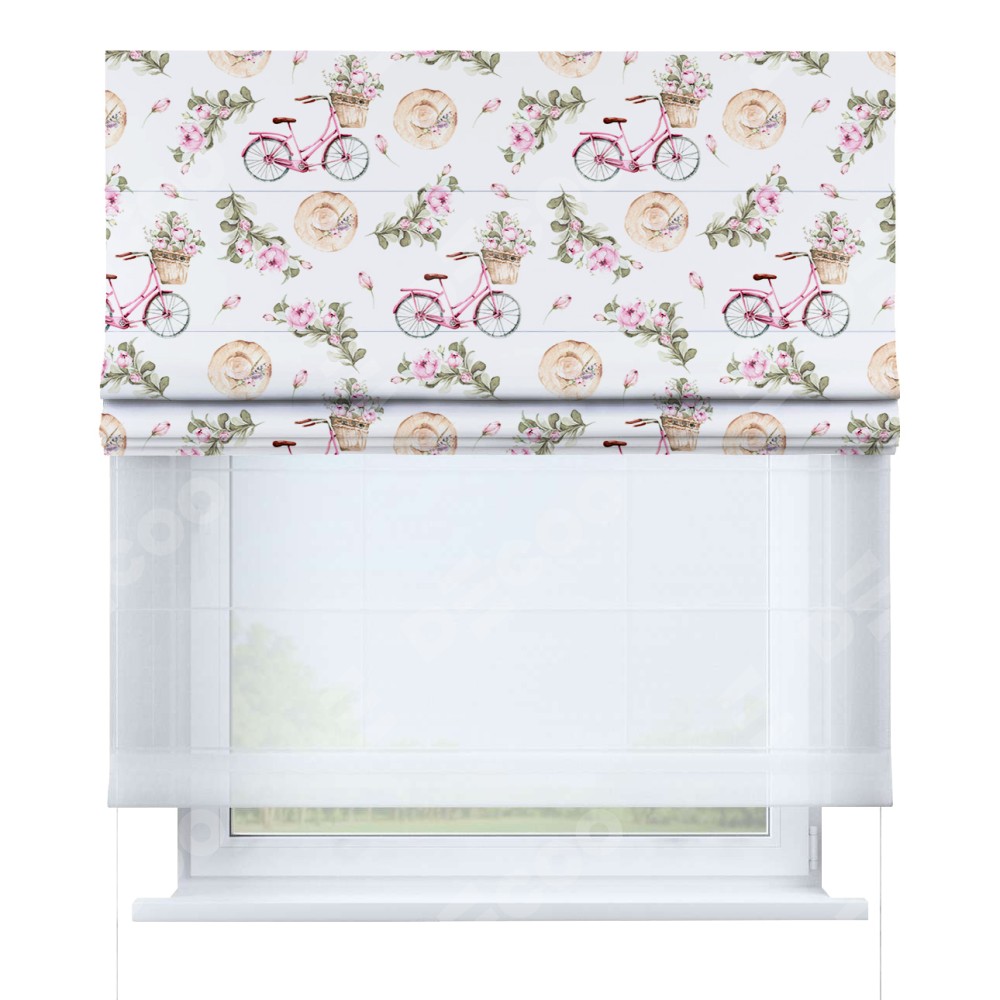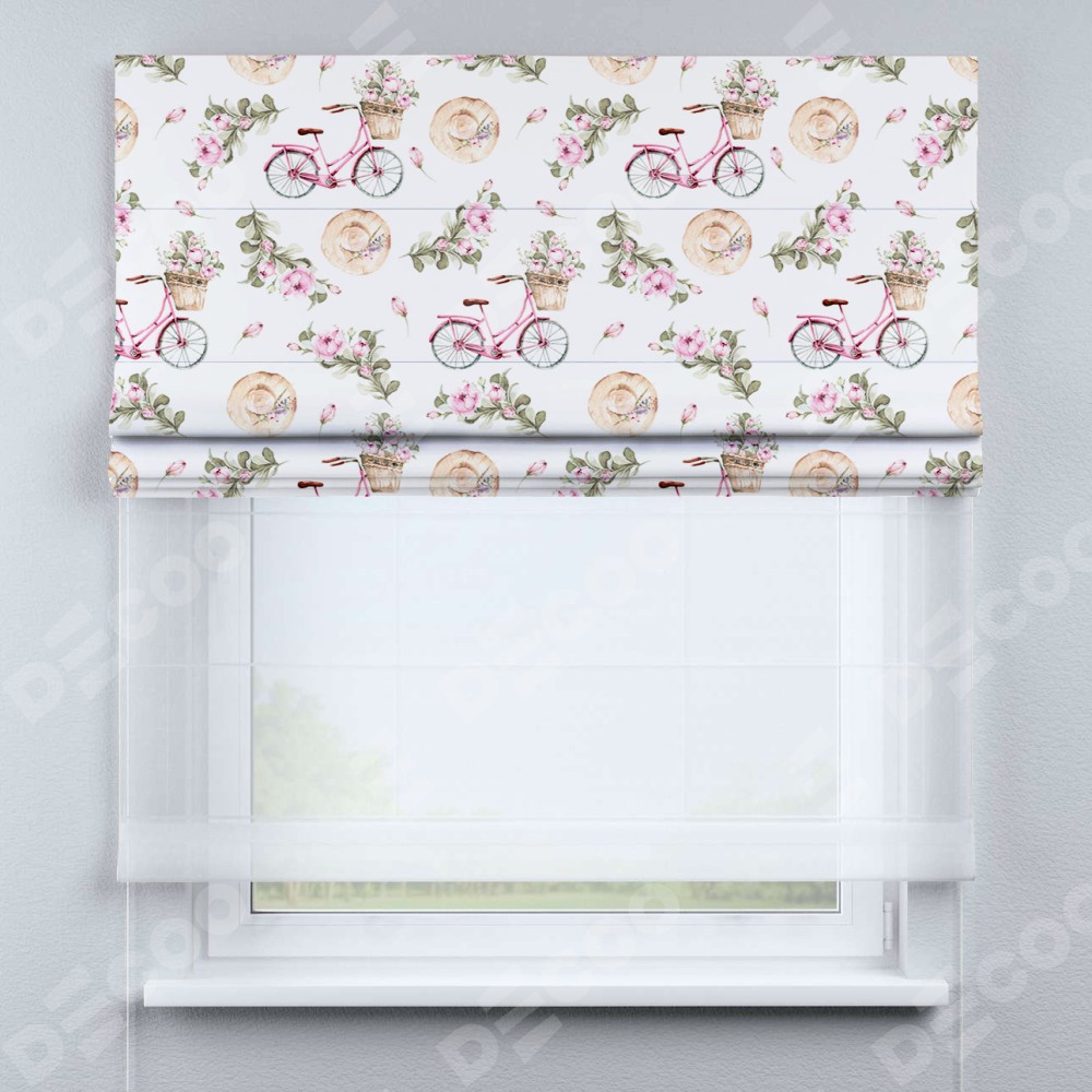 Римская штора день-ночь производителя «Cortin», используется для проёма, пошита из двух полотен, с лицевой блэкаут с нанесением сублимационной печати «Розовый велосипед», вторая ткань тюль (по стандарту комплектуется тюль белого цвета артикул V-01). Имеет универсальный механизм и подходит для монтажа: на потолок, на стену и в нишу.