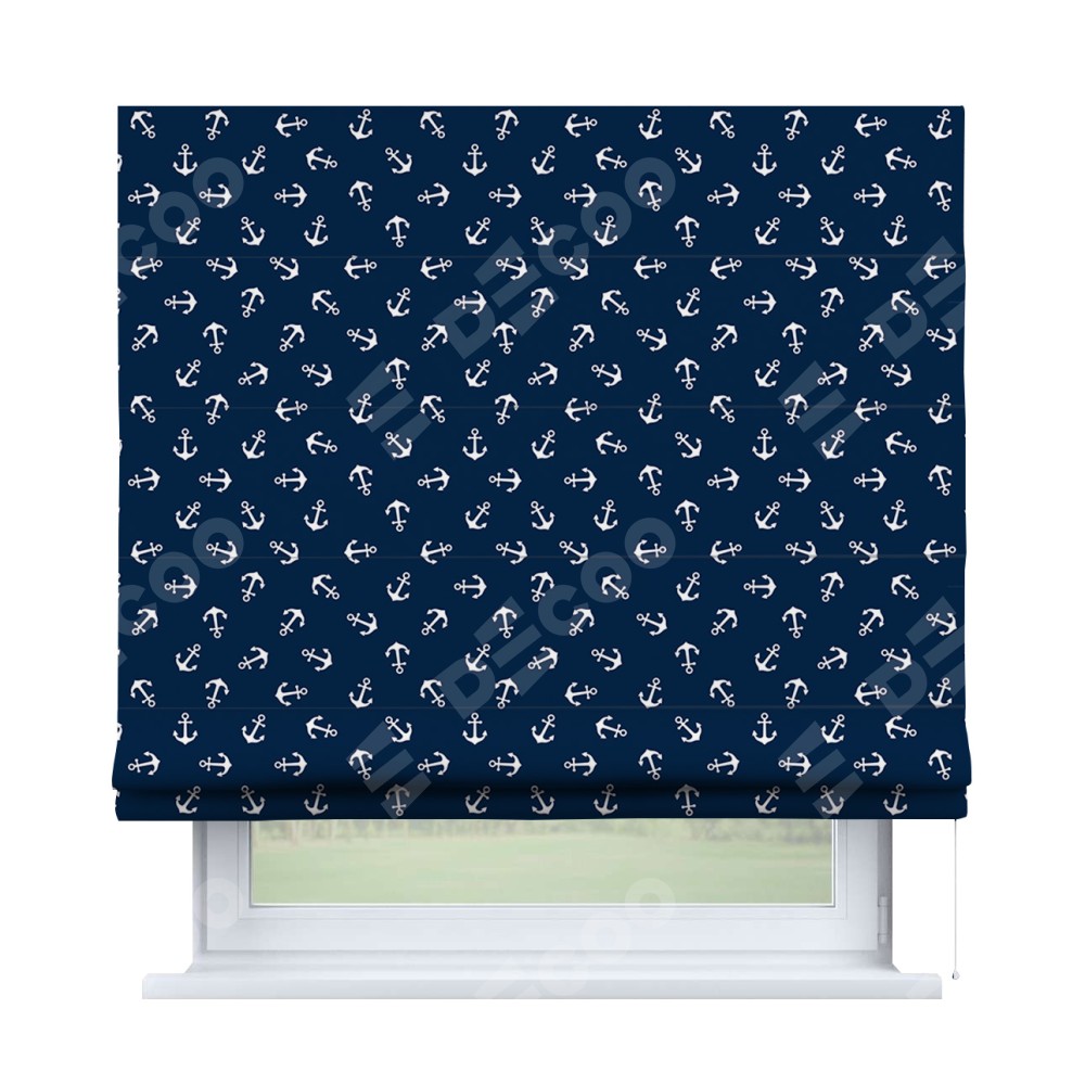 Римская штора производителя «Cortin», используется для проёма, пошита из ткани блэкаут с нанесением сублимационной печати «Морские якори». Имеет универсальный механизм и подходит для монтажа: на потолок, на стену и в нишу.