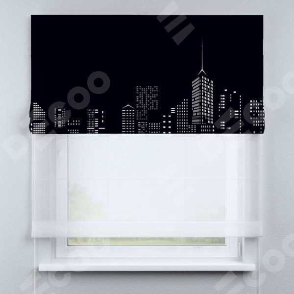 Римская штора день-ночь производителя «Cortin», используется для проёма, пошита из двух полотен, с лицевой блэкаут с нанесением сублимационной печати «Ночной город», вторая ткань тюль (по стандарту комплектуется тюль белого цвета артикул V-01). Имеет универсальный механизм и подходит для монтажа: на потолок, на стену и в нишу.