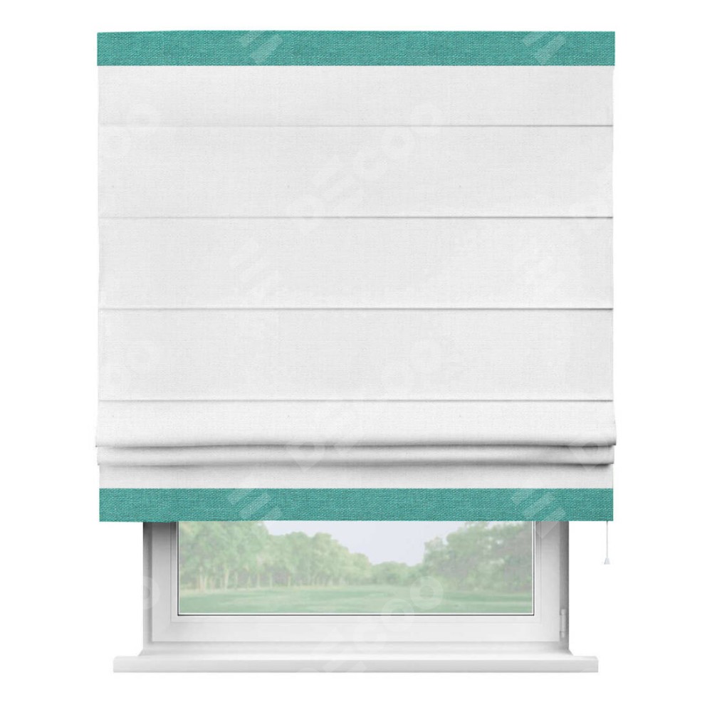 Римская штора производителя «Cortin», используется для проёма, пошита из ткани лён белый, артикул 53430. Отделка шторы кантом «Горизонт», ткань для канта используется из льна разной расцветки на выбор. Имеет универсальный механизм и подходит для монтажа: на потолок, на стену и в нишу.