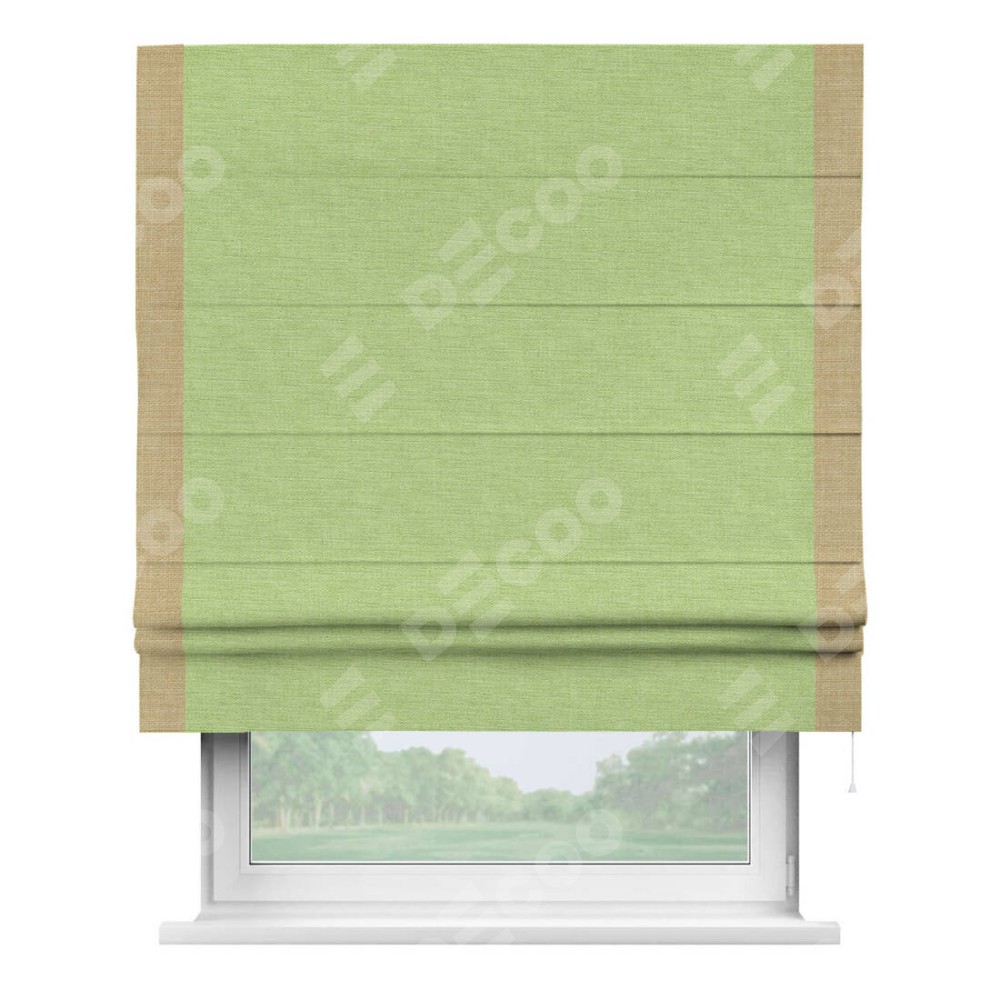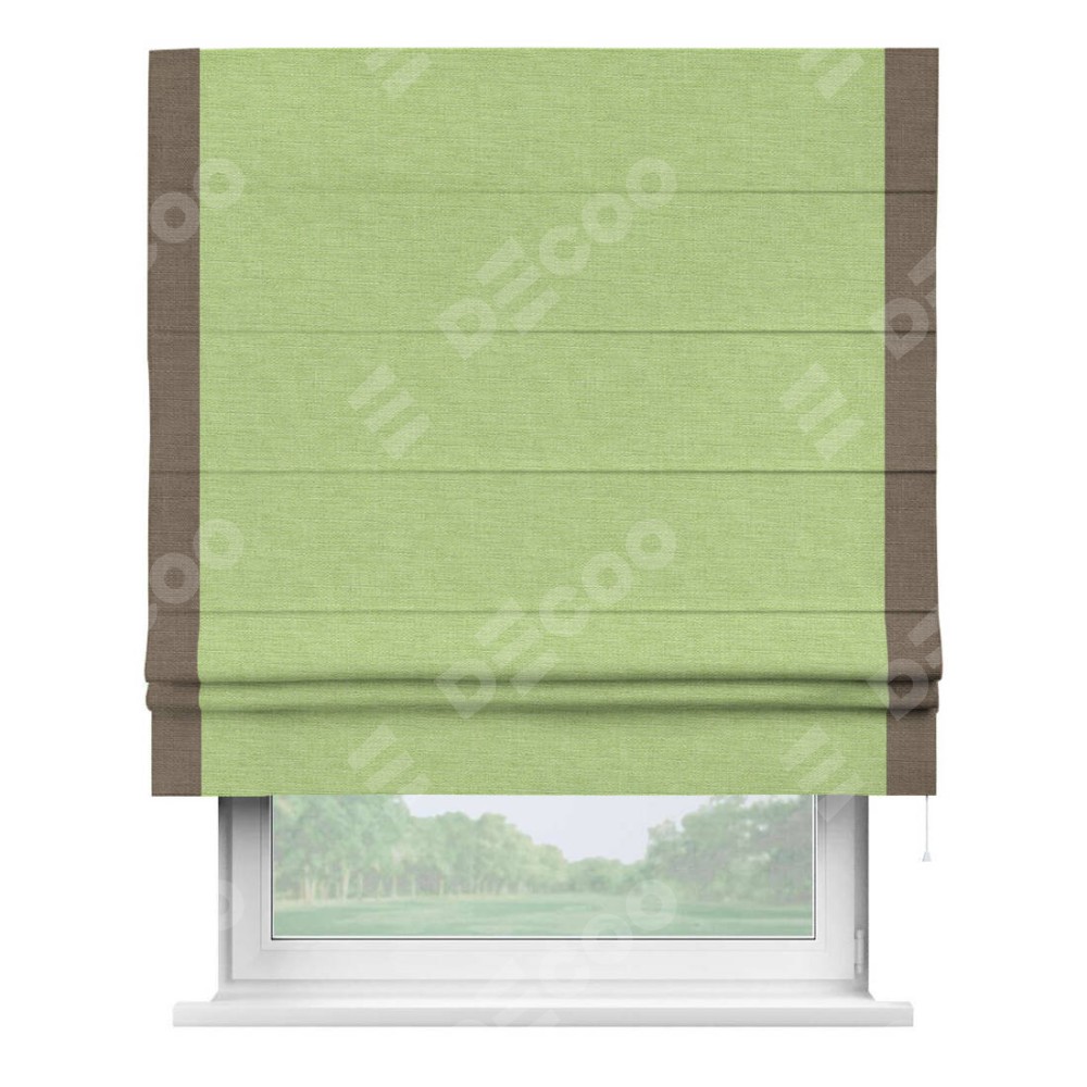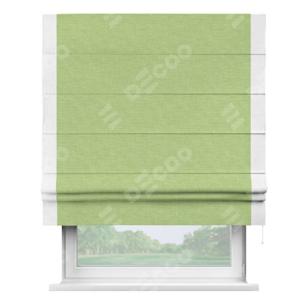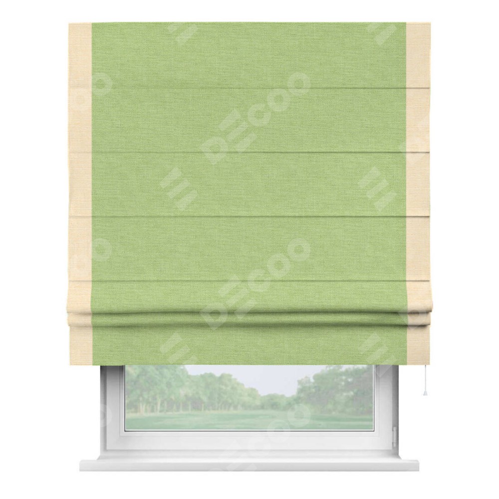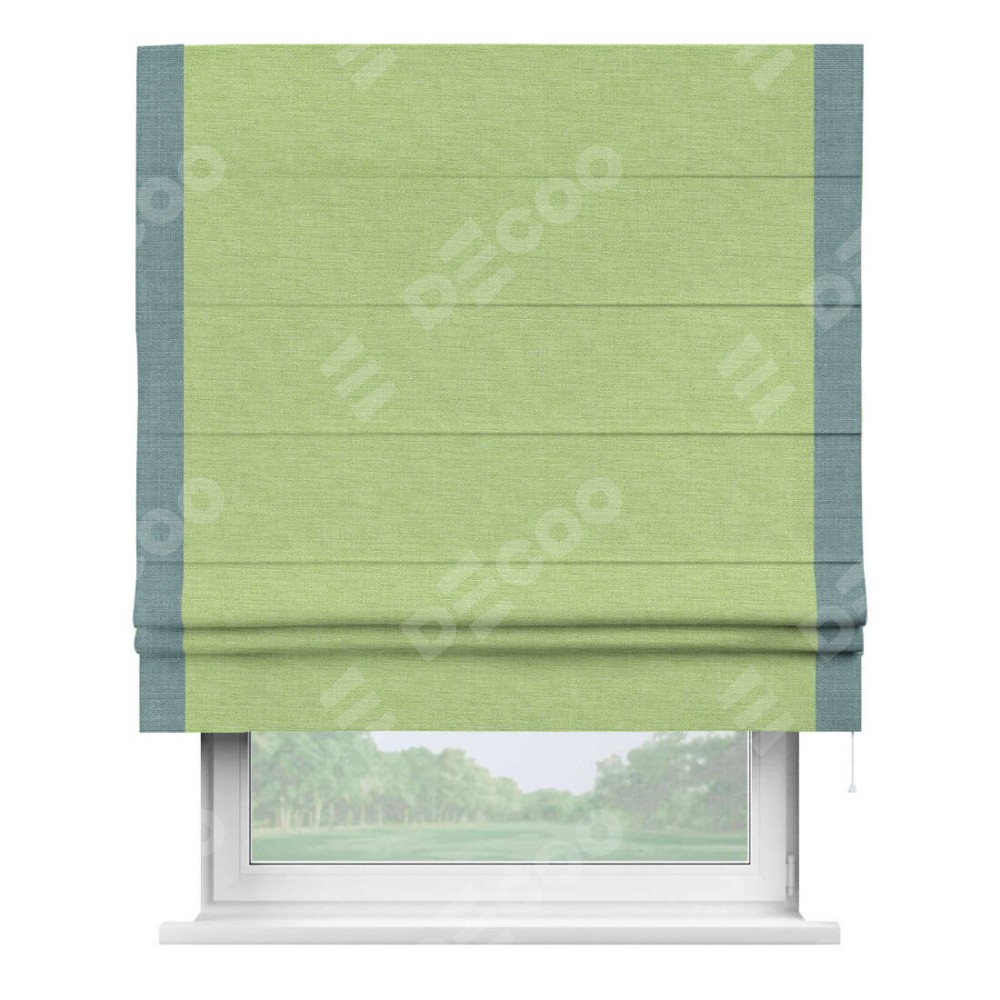 Римская штора производителя «Cortin», используется для проёма, пошита из ткани лён зеленый, артикул 85906. Отделка шторы кантом «Стрим Дуо», ткань для канта используется из льна разной расцветки на выбор. Имеет универсальный механизм и подходит для монтажа: на потолок, на стену и в нишу.