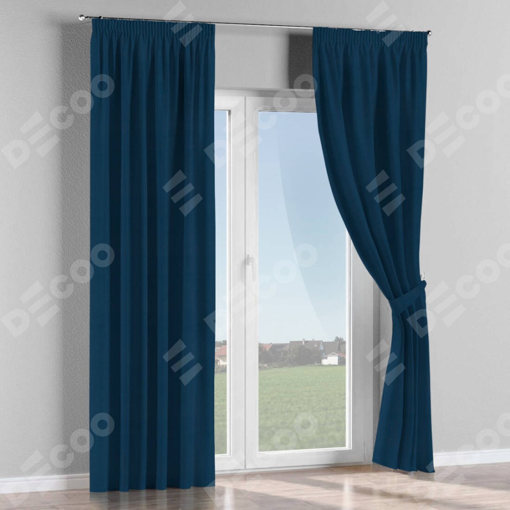 Комплект прямых штор, от производителя «Cortin», пошиты из ткани блэкаут однотонный синий, артикул ткани 29327. С изнаночной стороны в верхней части штор пристрачивается шторная лента с декоративными складками «Карандаш». Для создания элегантных складок прямые шторы шьются по стандарту с коэффициентом 1:2 (на 100 см. ширины проёма 200 см. ширины ткани).