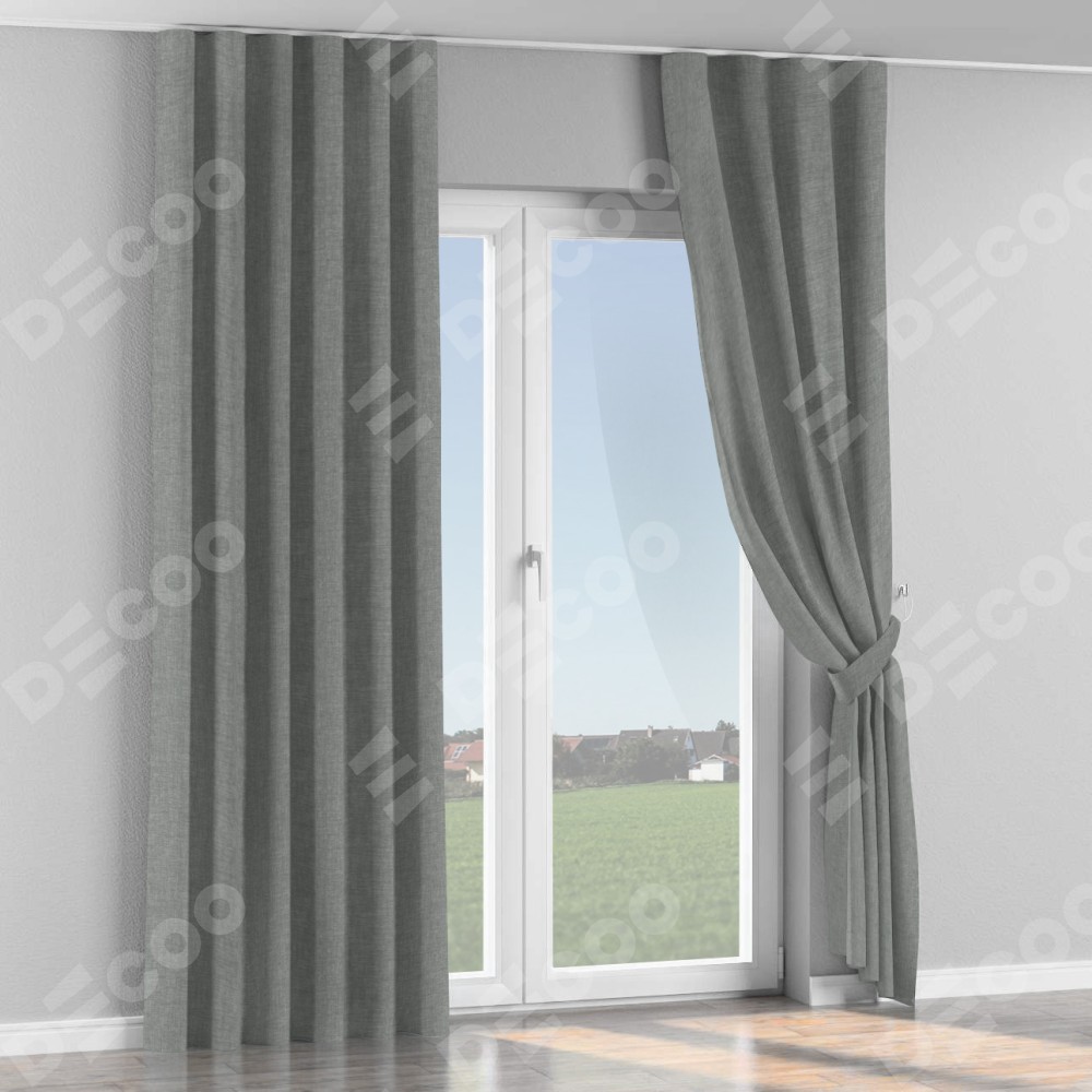 Комплект прямых штор, от производителя «Cortin», пошиты из ткани рогожка димаут тёмно-серый, артикул ткани 80418. С изнаночной стороны в верхней части штор пристрачивается шторная лента с декоративными складками «Волна». Для создания элегантных складок прямые шторы шьются по стандарту с коэффициентом 1:2 (на 100 см. ширины проёма 200 см. ширины ткани).