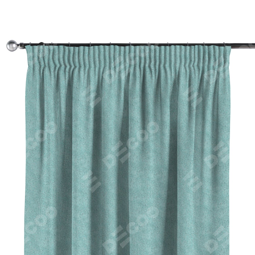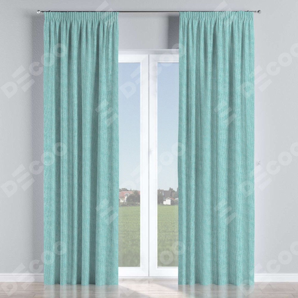 Комплект прямых штор, от производителя «Cortin», пошиты из ткани лён димаут бирюзовый, артикул ткани 23. С изнаночной стороны в верхней части штор пристрачивается шторная лента с декоративными складками «Карандаш». Для создания элегантных складок прямые шторы шьются по стандарту с коэффициентом 1:2 (на 100 см. ширины проёма 200 см. ширины ткани).