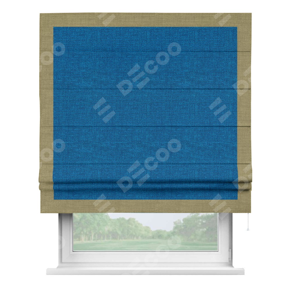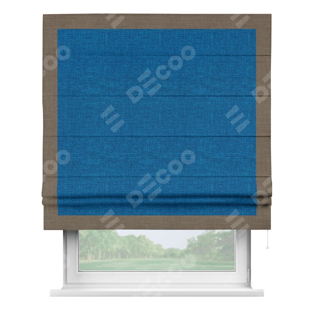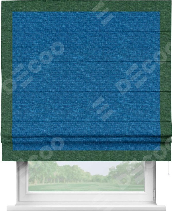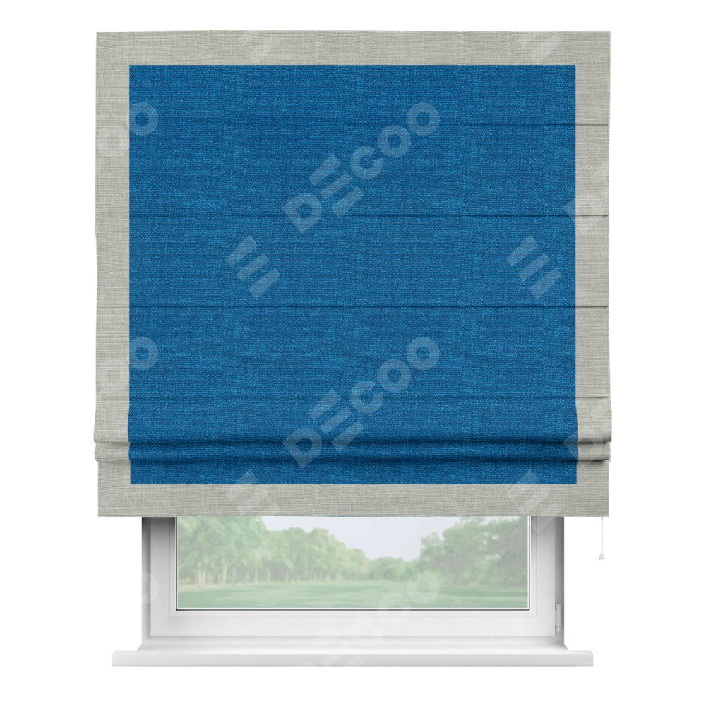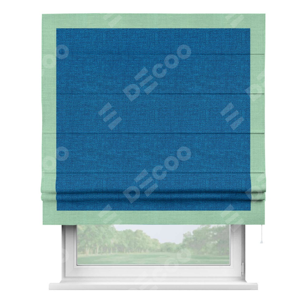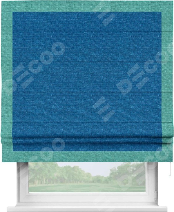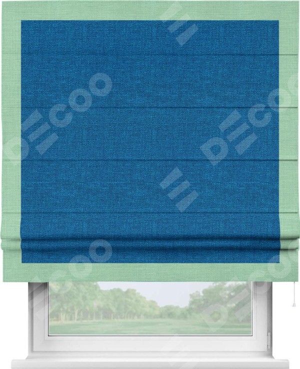 Римская штора производителя «Cortin», используется для проёма, пошита из ткани лён синий, артикул 63742. Отделка шторы кантом «Чесс», ткань для канта используется из льна разной расцветки на выбор. Имеет универсальный механизм и подходит для монтажа: на потолок, на стену и в нишу.