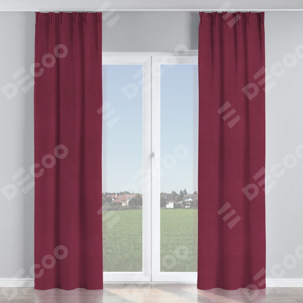 Комплект прямых штор, от производителя «Cortin», пошиты из ткани вельвет бордовый, артикул ткани 85553. С изнаночной стороны в верхней части штор пристрачивается шторная лента с декоративными складками «Кустик». Для создания элегантных складок прямые шторы шьются по стандарту с коэффициентом 1:2 (на 100 см. ширины проёма 200 см. ширины ткани).