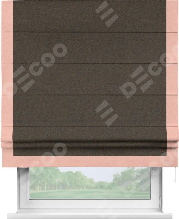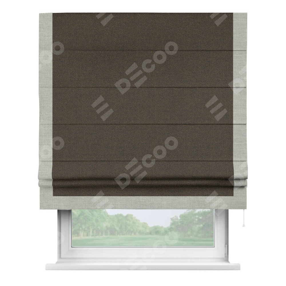 Римская штора производителя «Cortin», используется для проёма, пошита из ткани лён темно-коричневый, артикул 53444. Отделка шторы кантом «Виктория», ткань для канта используется из льна разной расцветки на выбор. Имеет универсальный механизм и подходит для монтажа: на потолок, на стену и в нишу.
