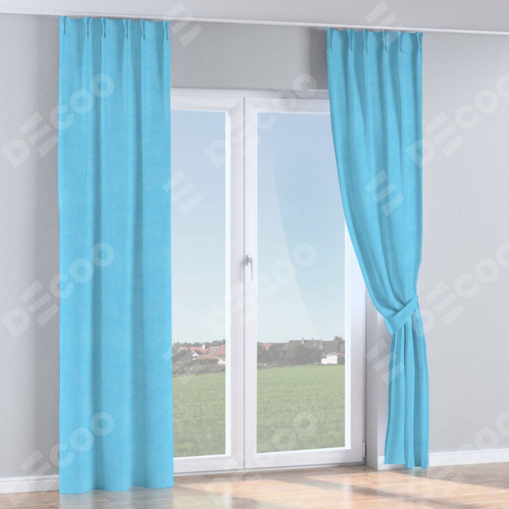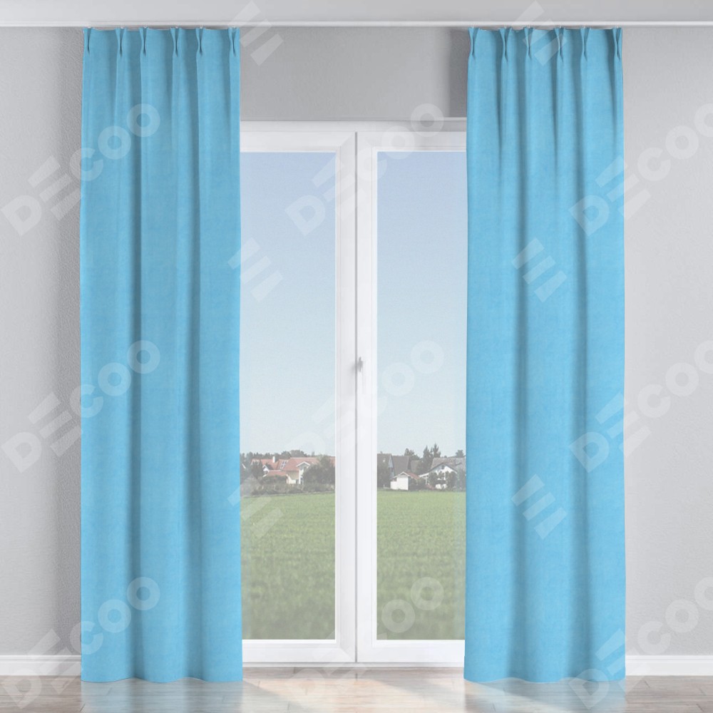 Комплект прямых штор, от производителя «Cortin», пошиты из ткани вельвет голубой, артикул ткани 85544. С изнаночной стороны в верхней части штор пристрачивается шторная лента с декоративными складками «Кустик». Для создания элегантных складок прямые шторы шьются по стандарту с коэффициентом 1:2 (на 100 см. ширины проёма 200 см. ширины ткани).
