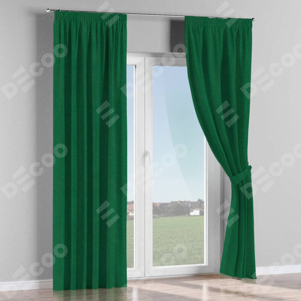 Комплект прямых штор, от производителя «Cortin», пошиты из ткани вельвет зелёный, артикул ткани 85546. С изнаночной стороны в верхней части штор пристрачивается шторная лента с декоративными складками «Карандаш». Для создания элегантных складок прямые шторы шьются по стандарту с коэффициентом 1:2 (на 100 см. ширины проёма 200 см. ширины ткани).