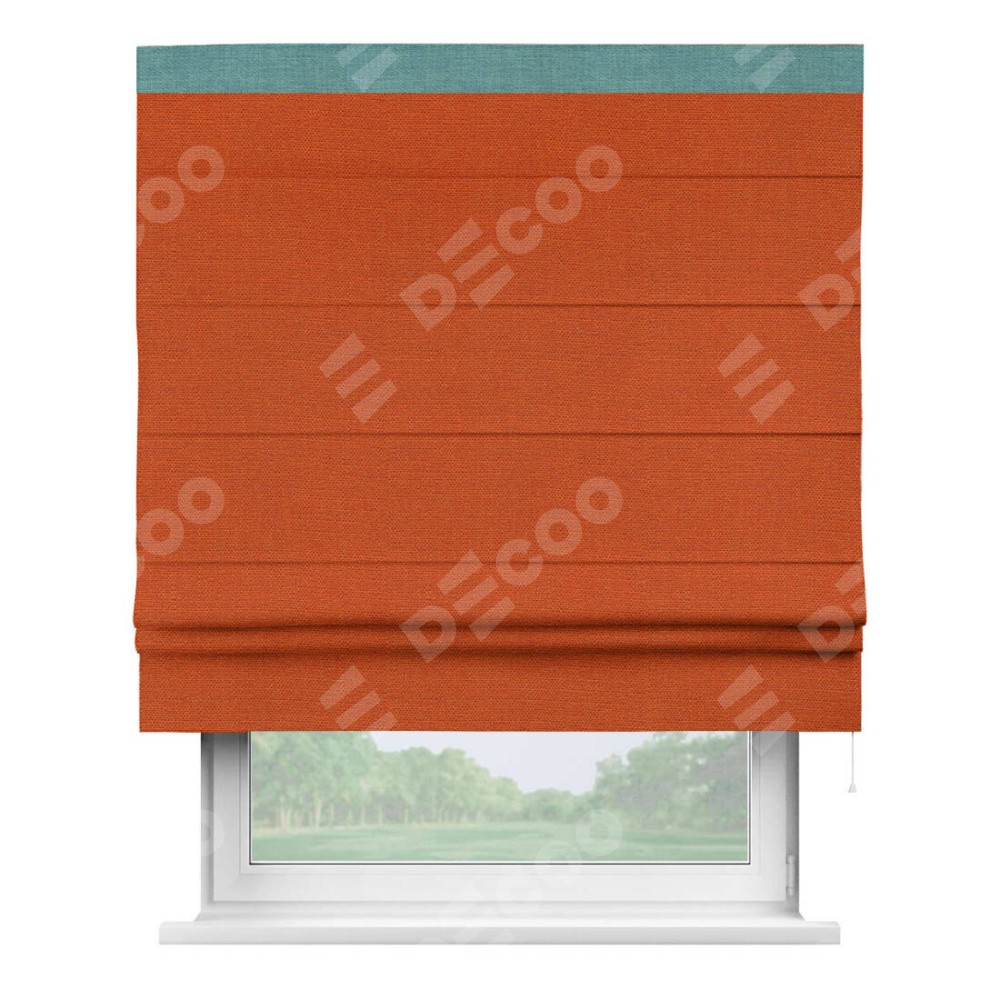Римская штора производителя «Cortin», используется для проёма, пошита из ткани лён терракотовый, артикул 53440. Отделка шторы кантом «Кинг», ткань для канта используется из льна разной расцветки на выбор. Имеет универсальный механизм и подходит для монтажа: на потолок, на стену и в нишу.