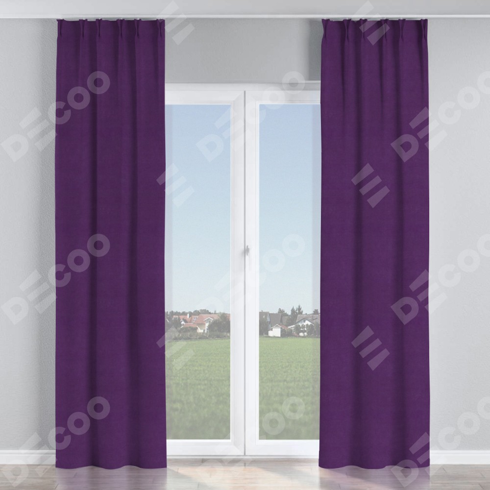 Комплект прямых штор, от производителя «Cortin», пошиты из ткани вельвет тёмно-фиолетовый, артикул ткани 17753. С изнаночной стороны в верхней части штор пристрачивается шторная лента с декоративными складками «Кустик». Для создания элегантных складок прямые шторы шьются по стандарту с коэффициентом 1:2 (на 100 см. ширины проёма 200 см. ширины ткани).