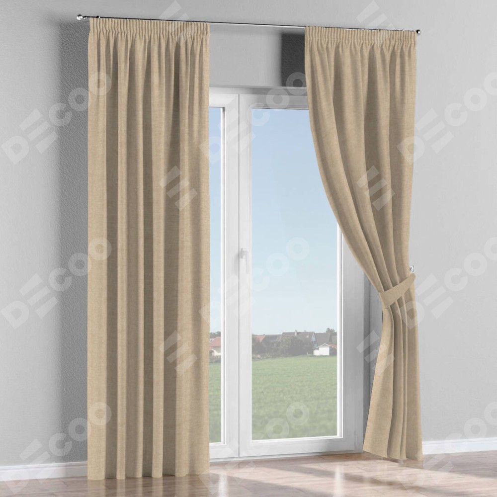 Комплект прямых штор, от производителя «Cortin», пошиты из ткани лён кашемир бежевый, артикул ткани 17206. С изнаночной стороны в верхней части штор пристрачивается шторная лента с декоративными складками «Карандаш». Для создания элегантных складок прямые шторы шьются по стандарту с коэффициентом 1:2 (на 100 см. ширины проёма 200 см. ширины ткани).