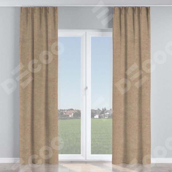 Комплект прямых штор, от производителя «Cortin», пошиты из ткани лён кашемир коричневый, артикул ткани 21614. С изнаночной стороны в верхней части штор пристрачивается шторная лента с декоративными складками «Кустик». Для создания элегантных складок прямые шторы шьются по стандарту с коэффициентом 1:2 (на 100 см. ширины проёма 200 см. ширины ткани).