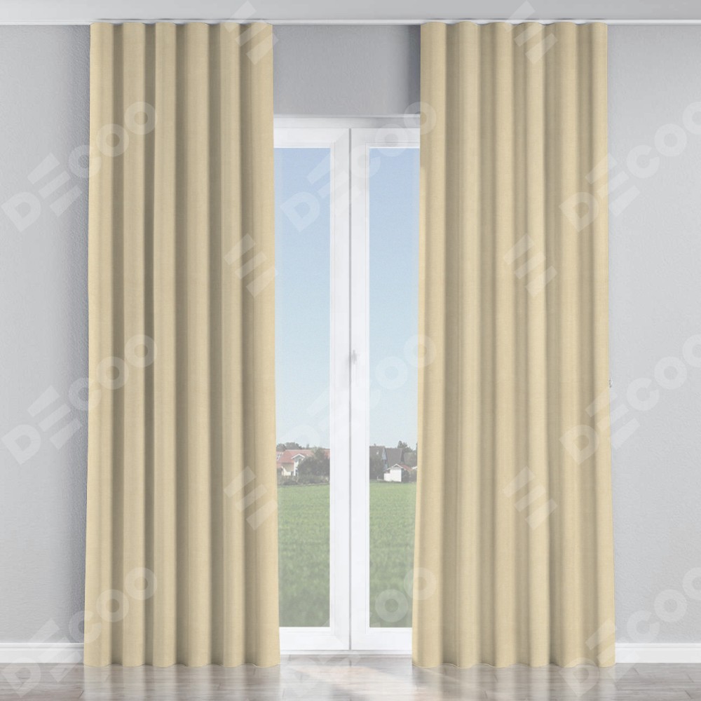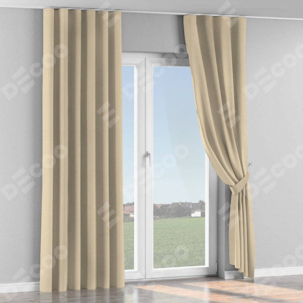 Комплект прямых штор, от производителя «Cortin», пошиты из ткани софт однотонный бежевый лайт, артикул ткани 33100. С изнаночной стороны в верхней части штор пристрачивается шторная лента с декоративными складками «Волна». Для создания элегантных складок прямые шторы шьются по стандарту с коэффициентом 1:2 (на 100 см. ширины проёма 200 см. ширины ткани).