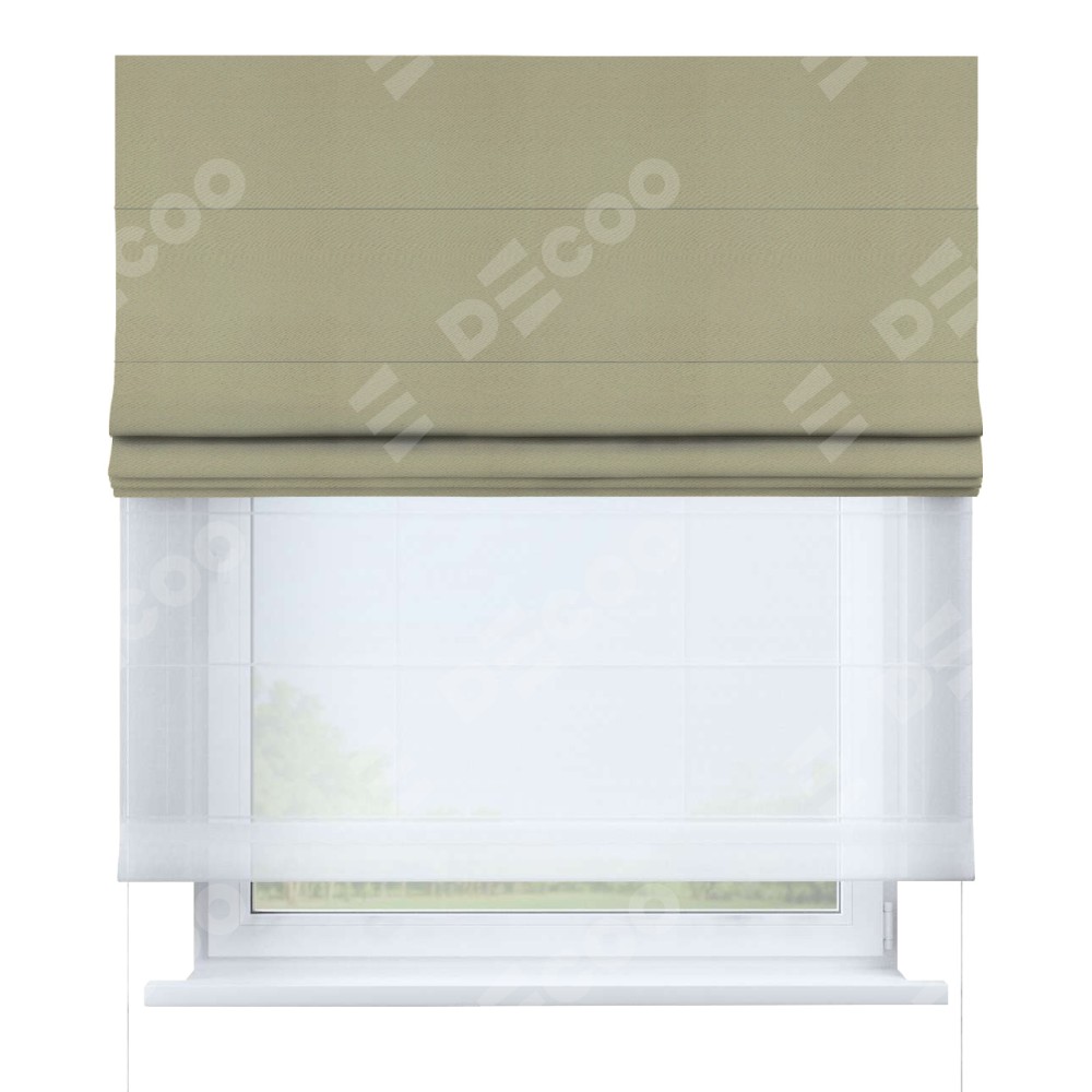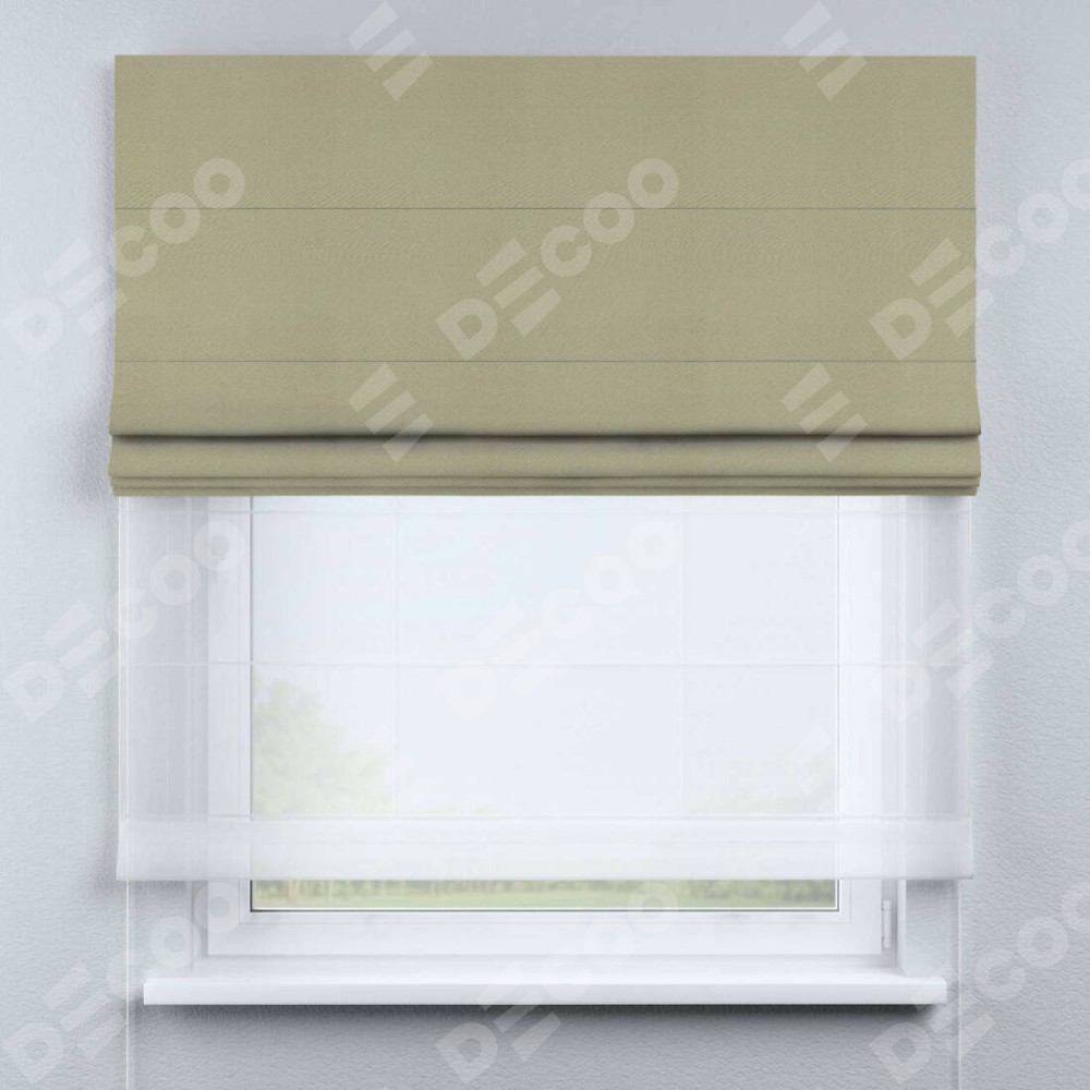 Римская штора день-ночь производителя «Cortin», используется для проёма, пошита из двух полотен, с лицевой стороны блэкаут однотонный милано капучино артикул 06, вторая ткань тюль (по стандарту комплектуется тюль белого цвета артикул V-01). Имеет универсальный механизм и подходит для монтажа: на потолок, на стену и в нишу.