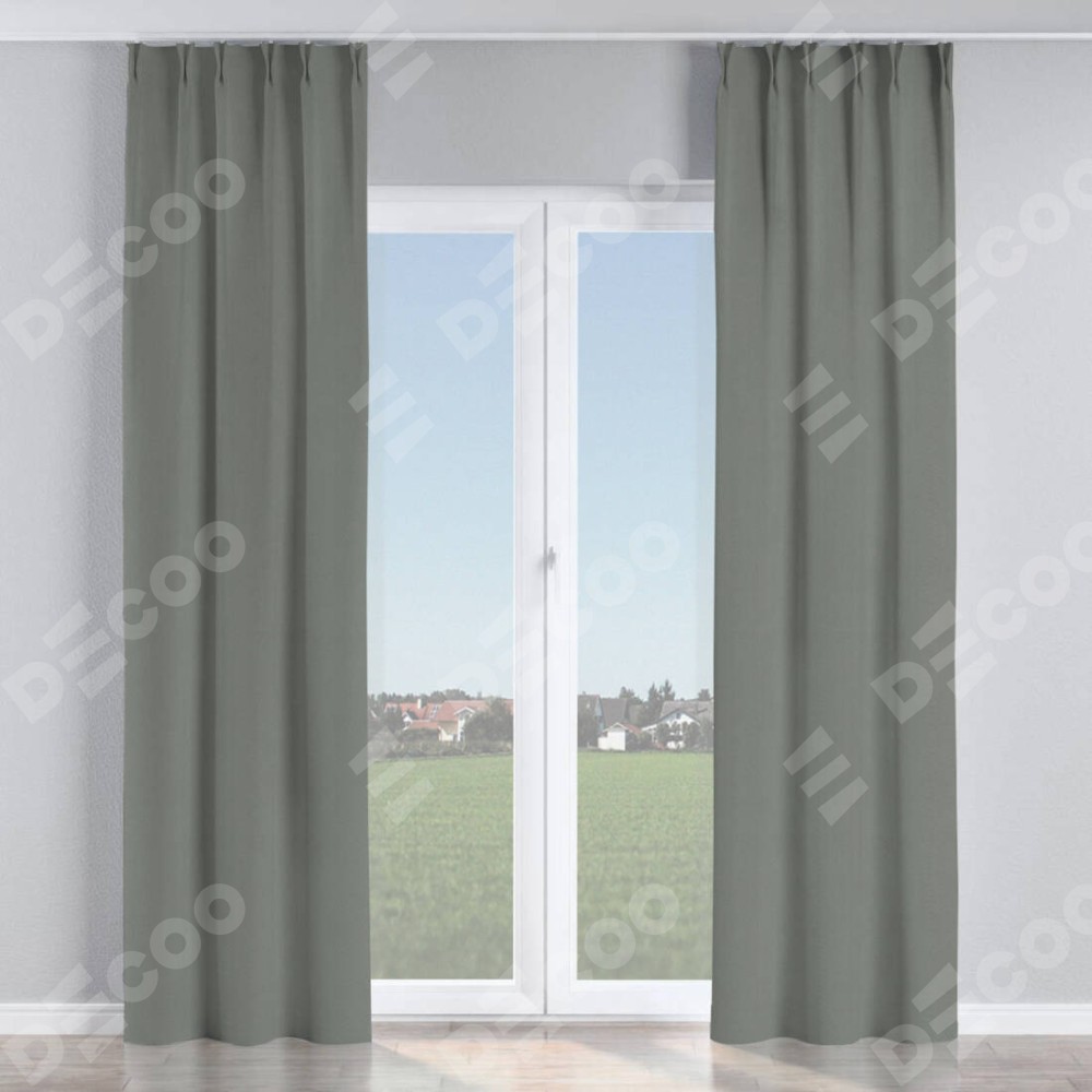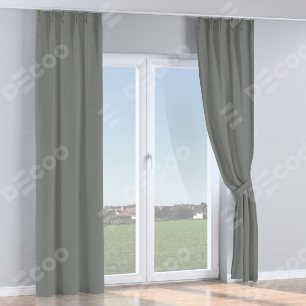 Комплект прямых штор, от производителя «Cortin», пошиты из ткани блэкаут однотонный тёмно-серый, артикул ткани 18077. С изнаночной стороны в верхней части штор пристрачивается шторная лента с декоративными складками «Кустик». Для создания элегантных складок прямые шторы шьются по стандарту с коэффициентом 1:2 (на 100 см. ширины проёма 200 см. ширины ткани).