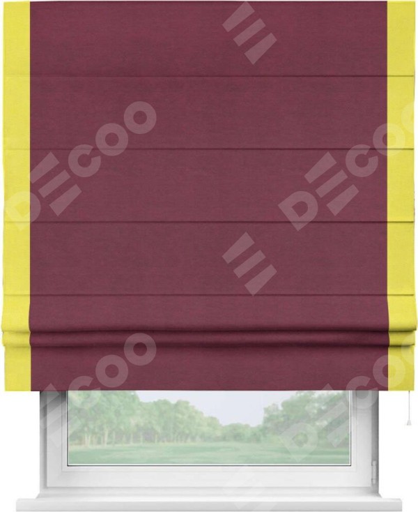 Римская штора производителя «Cortin», используется для проёма, пошита из ткани вельвет бордовый, артикул ткани 85553. Отделка шторы кантом «Стрим Дуо», ткань для канта используется из вельвета разной расцветки на выбор. Имеет универсальный механизм и подходит для монтажа: на потолок, на стену и в нишу.