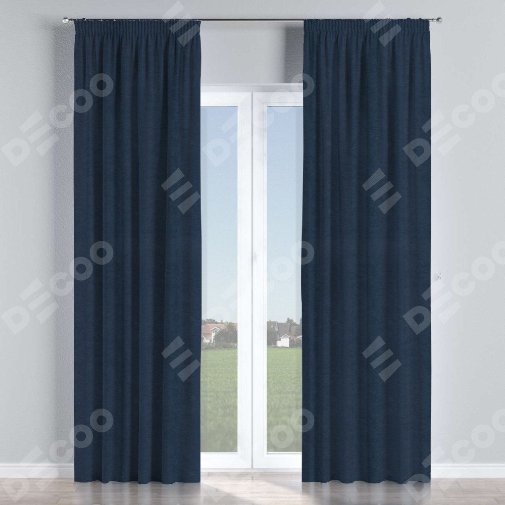 Комплект прямых штор, от производителя «Cortin», пошиты из ткани софт однотонный тёмно-синий, артикул ткани 33111. С изнаночной стороны в верхней части штор пристрачивается шторная лента с декоративными складками «Карандаш». Для создания элегантных складок прямые шторы шьются по стандарту с коэффициентом 1:2 (на 100 см. ширины проёма 200 см. ширины ткани).