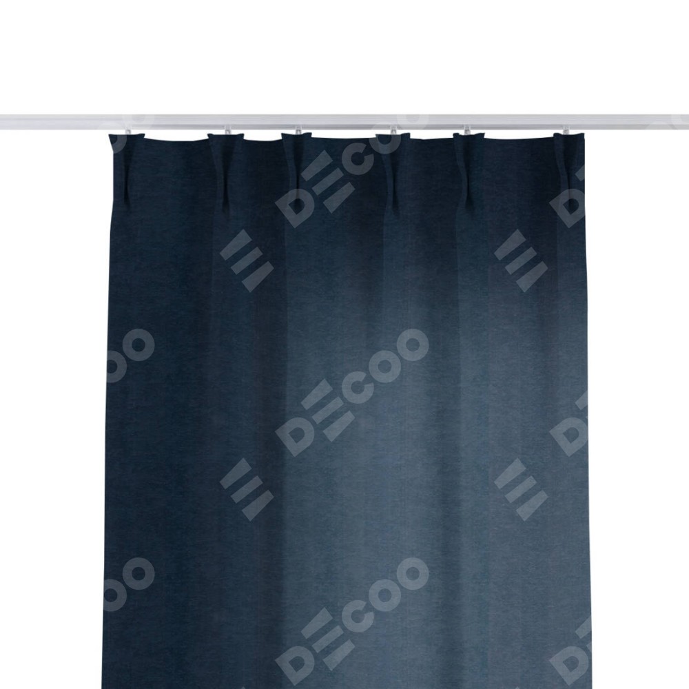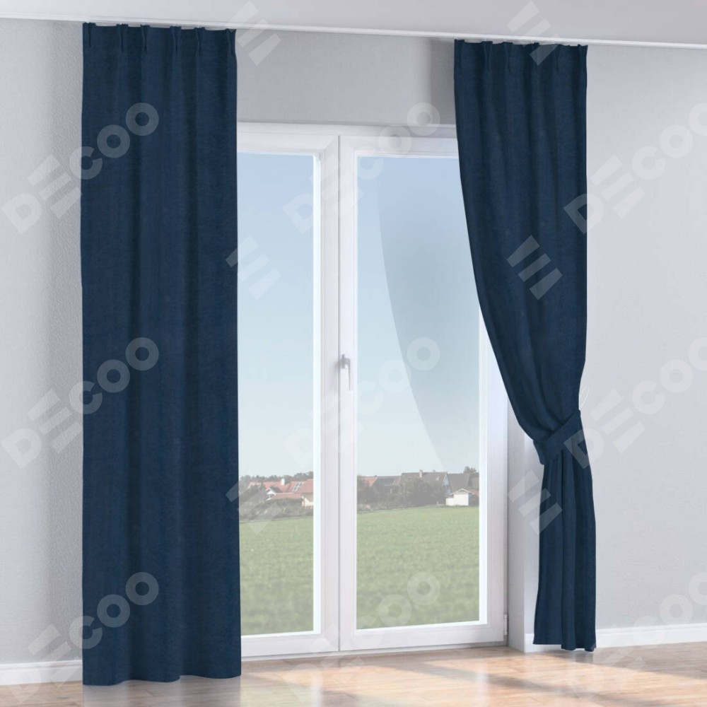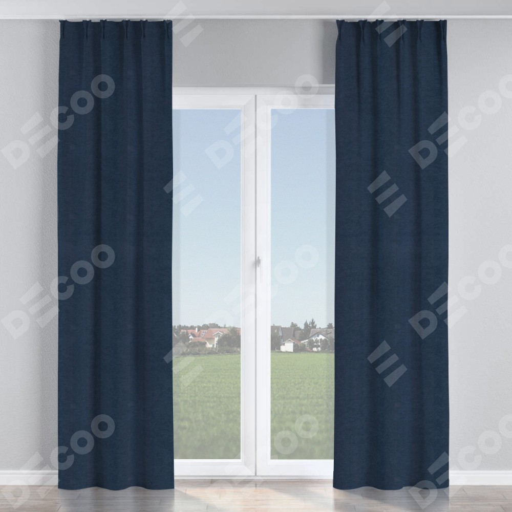 Комплект прямых штор, от производителя «Cortin», пошиты из ткани софт однотонный тёмно-синий, артикул ткани 33111. С изнаночной стороны в верхней части штор пристрачивается шторная лента с декоративными складками «Кустик». Для создания элегантных складок прямые шторы шьются по стандарту с коэффициентом 1:2 (на 100 см. ширины проёма 200 см. ширины ткани).