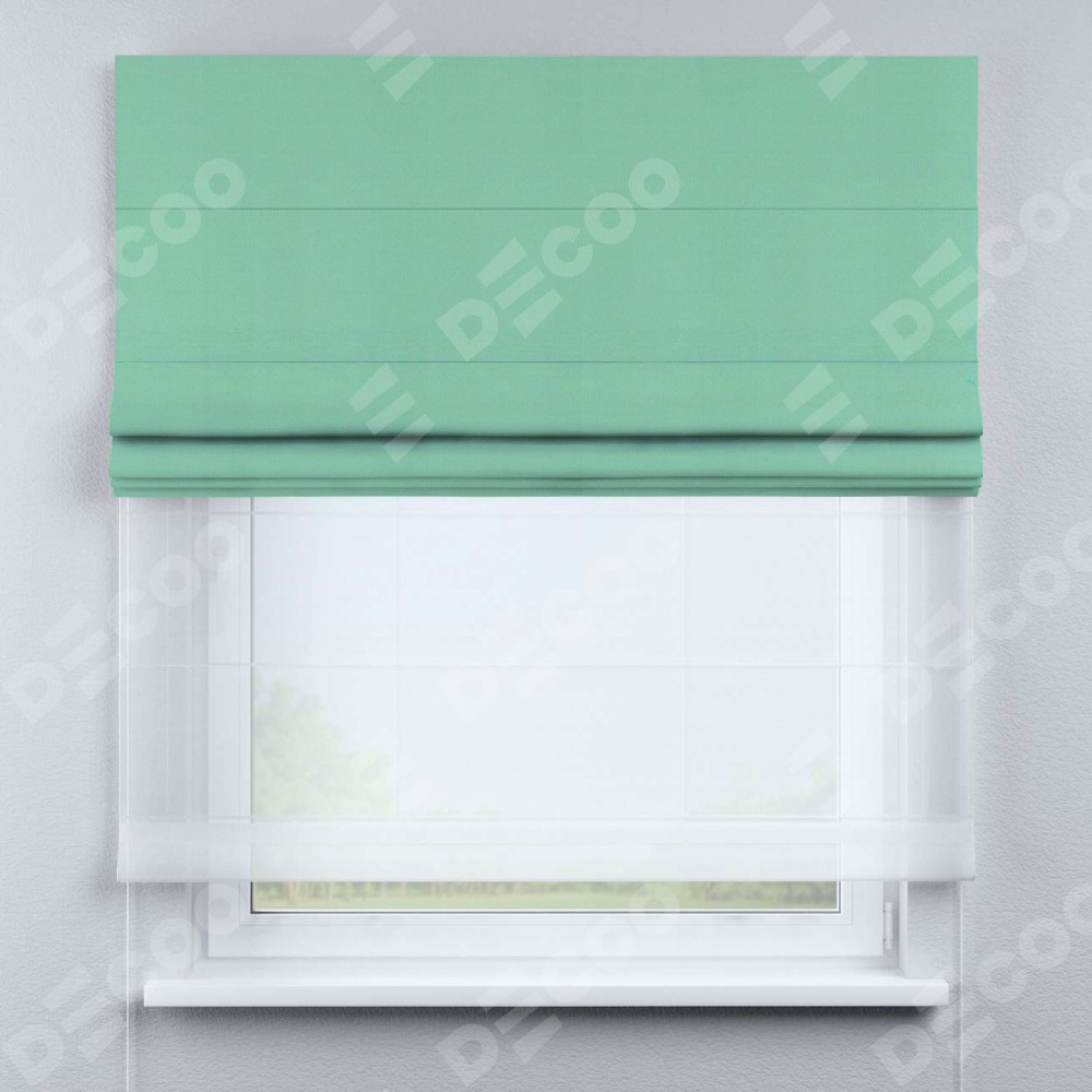 Римская штора день-ночь производителя «Cortin», используется для проёма, пошита из двух полотен, с лицевой стороны pipa блэкаут бирюза артикул 81852, вторая ткань тюль (по стандарту комплектуется тюль белого цвета артикул V-01). Имеет универсальный механизм и подходит для монтажа: на потолок, на стену и в нишу.