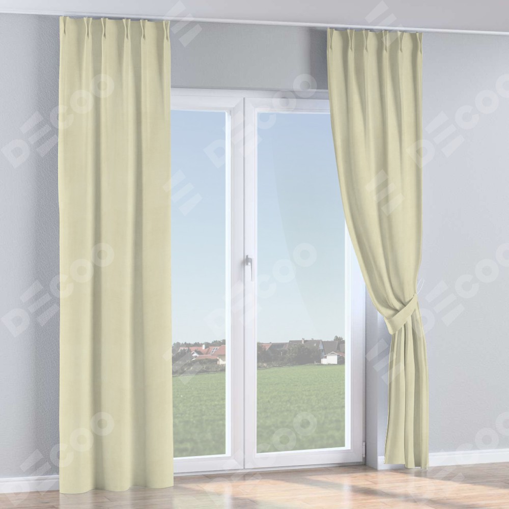 Комплект прямых штор, от производителя «Cortin», пошиты из ткани бархат молочный, артикул ткани 21409. С изнаночной стороны в верхней части штор пристрачивается шторная лента с декоративными складками «Кустик». Для создания элегантных складок прямые шторы шьются по стандарту с коэффициентом 1:2 (на 100 см. ширины проёма 200 см. ширины ткани).