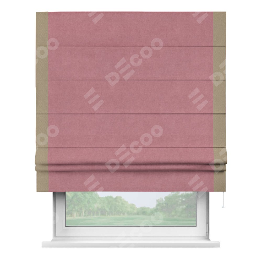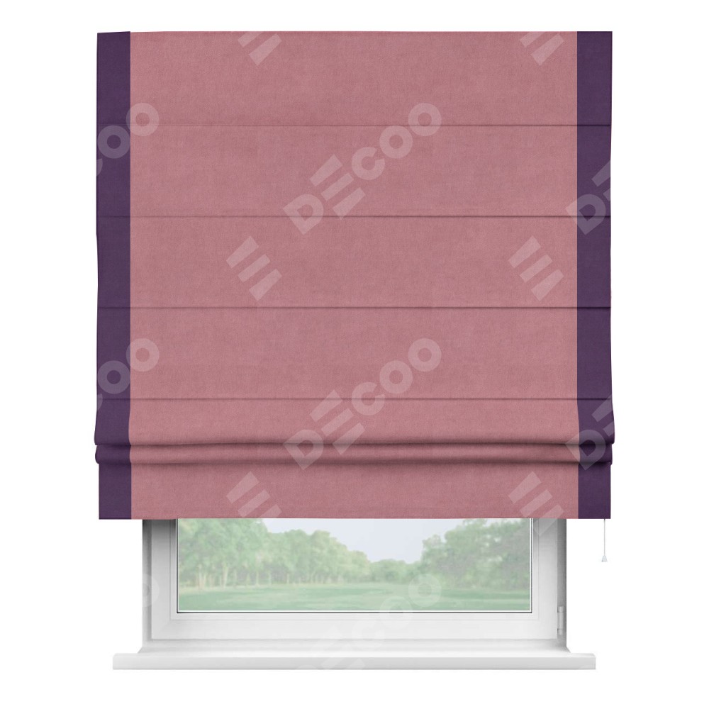 Римская штора производителя «Cortin», используется для проёма, пошита из ткани вельвет брусника, артикул ткани 85550. Отделка шторы кантом «Стрим Дуо», ткань для канта используется из вельвета разной расцветки на выбор. Имеет универсальный механизм и подходит для монтажа: на потолок, на стену и в нишу.
