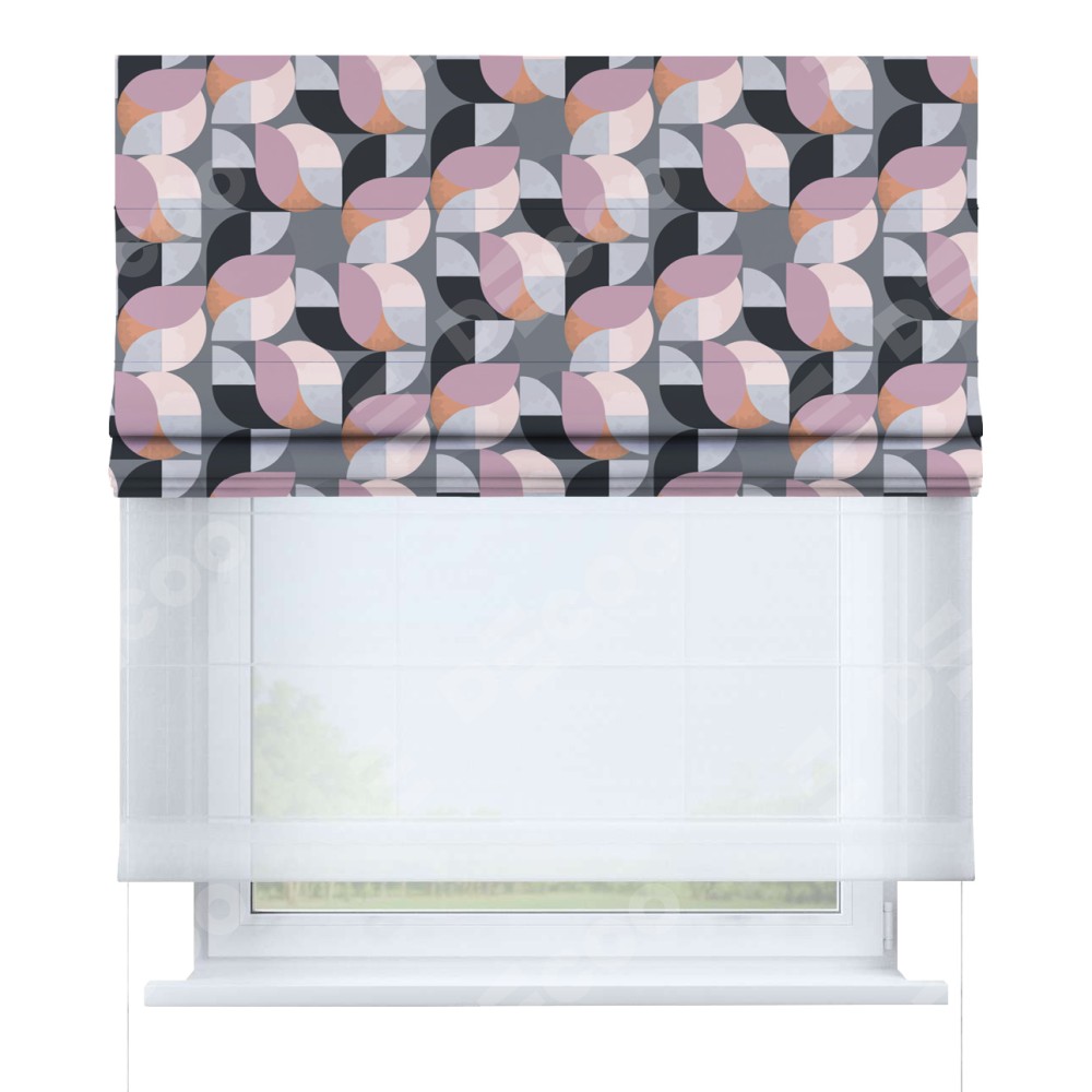 Римская штора день-ночь производителя «Cortin», используется для проёма, пошита из двух полотен, с лицевой блэкаут с нанесением сублимационной печати «Абстрактный узор», вторая ткань тюль (по стандарту комплектуется тюль белого цвета артикул V-01). Имеет универсальный механизм и подходит для монтажа: на потолок, на стену и в нишу.
