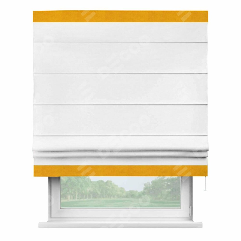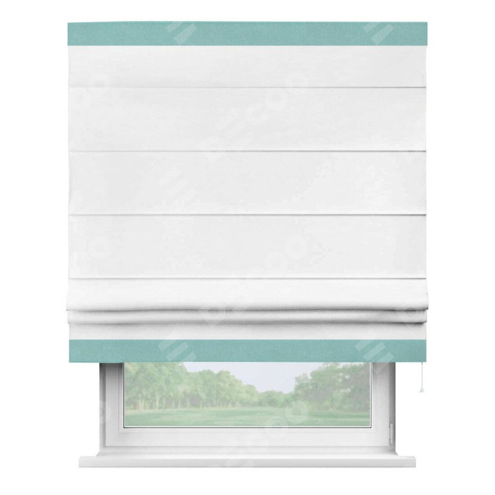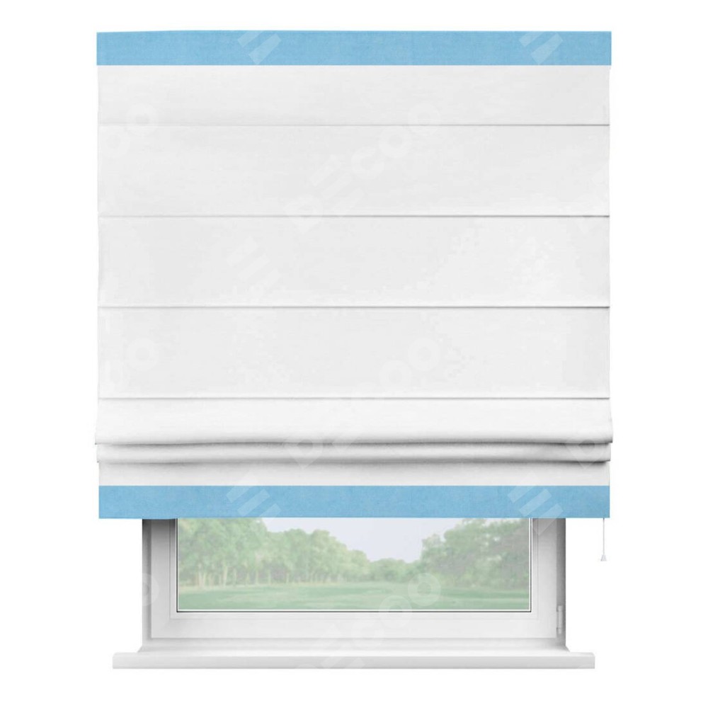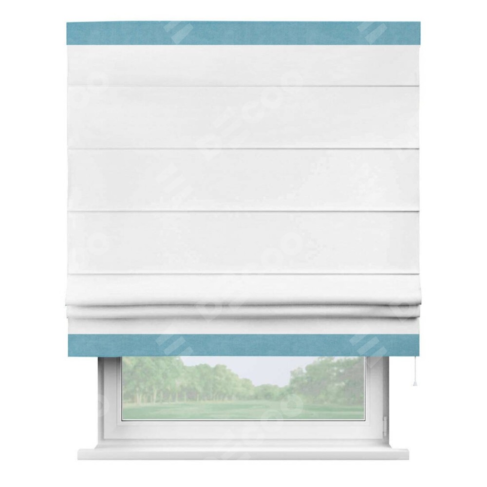 Римская штора производителя «Cortin», используется для проёма, пошита из ткани вельвет дымчато-белый, артикул ткани 85535. Отделка шторы кантом «Горизонт», ткань для канта используется из вельвета разной расцветки на выбор. Имеет универсальный механизм и подходит для монтажа: на потолок, на стену и в нишу.