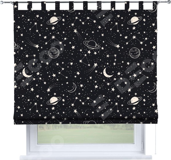 Римская штора производителя «Cortin», используется для проёма, пошита из ткани блэкаут с нанесением сублимационной печати «Глубокий космос». Данная модель пошита на петлях, комплектуется на выбор круглым карнизом и подходит для монтажа на стену. Римская штора на петлях имеет простую систему регулировки высоты, отличительным преимуществом данной модели является простой способ монтажа. Достаточно повесить ее на трубу и штора готова!