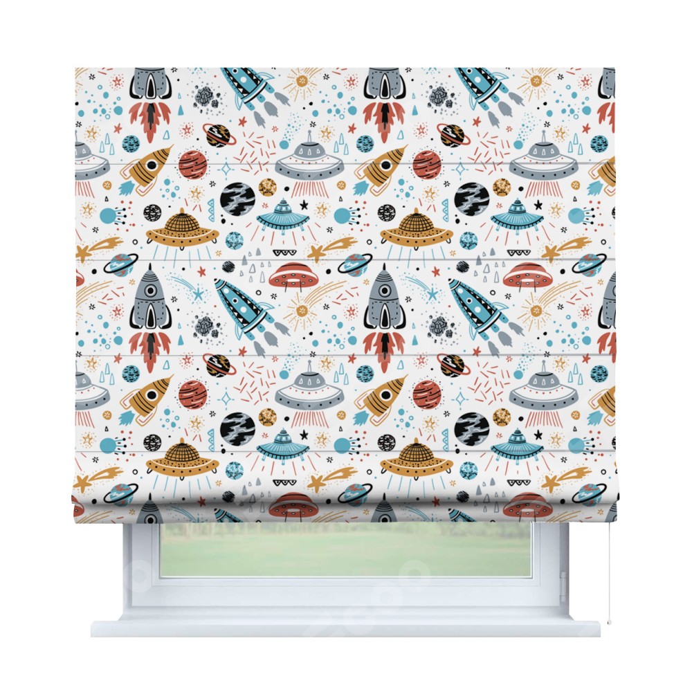 Римская штора производителя «Cortin», используется для проёма, пошита из ткани блэкаут с нанесением сублимационной печати «Космическое приключение». Имеет универсальный механизм и подходит для монтажа: на потолок, на стену и в нишу.