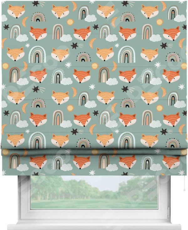 Римская штора производителя «Cortin», используется для проёма, пошита из ткани блэкаут с нанесением сублимационной печати «Озорные лисички». Имеет универсальный механизм и подходит для монтажа: на потолок, на стену и в нишу.