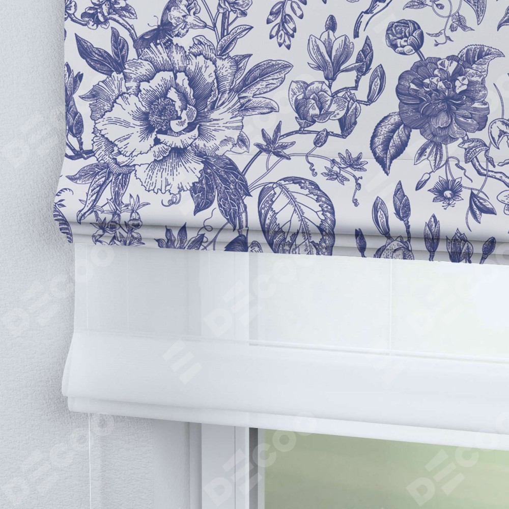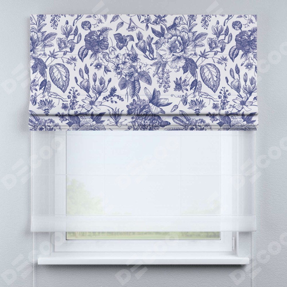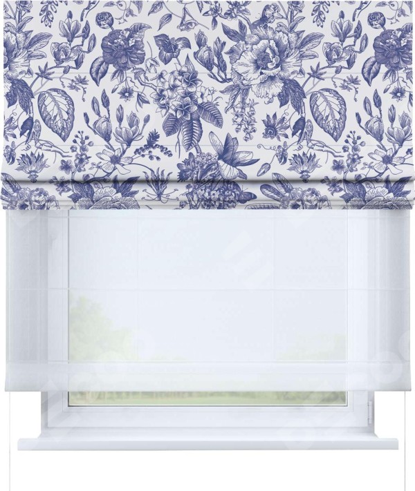 Римская штора день-ночь производителя «Cortin», используется для проёма, пошита из двух полотен, с лицевой блэкаут с нанесением сублимационной печати «Прованс в синем», вторая ткань тюль (по стандарту комплектуется тюль белого цвета артикул V-01). Имеет универсальный механизм и подходит для монтажа: на потолок, на стену и в нишу.