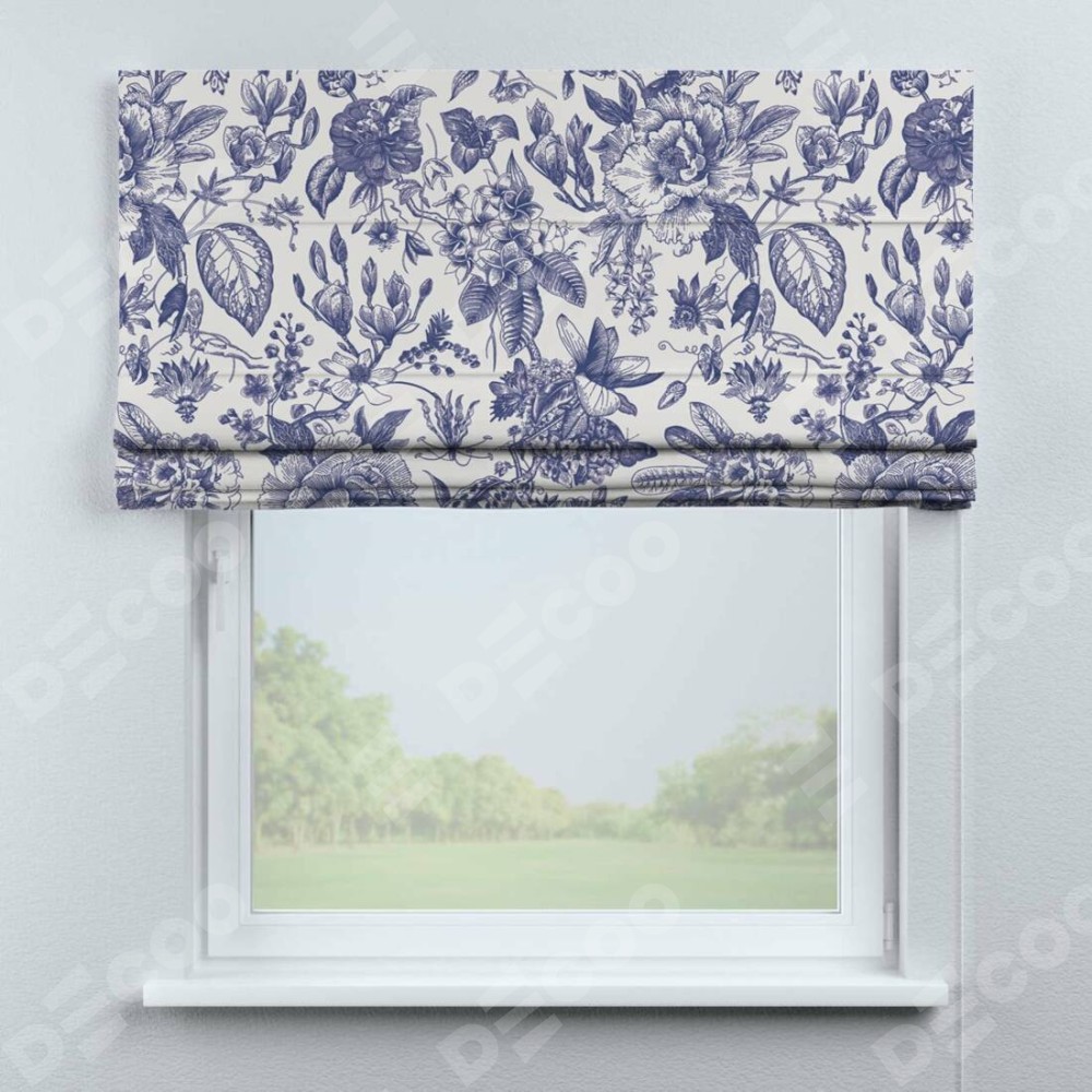 Римская штора производителя «Cortin», используется для проёма, пошита из ткани блэкаут с нанесением сублимационной печати «Прованс в синем». Имеет универсальный механизм и подходит для монтажа: на потолок, на стену и в нишу.