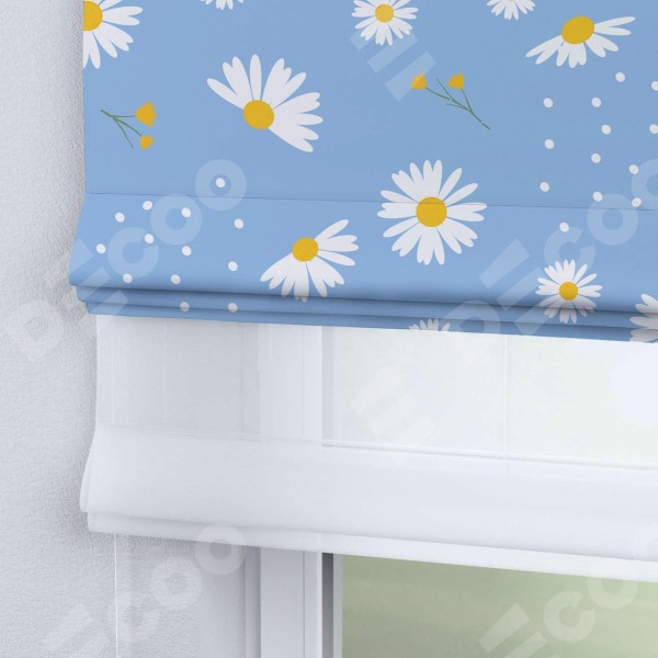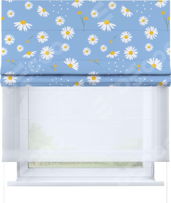 Римская штора день-ночь производителя «Cortin», используется для проёма, пошита из двух полотен, с лицевой блэкаут с нанесением сублимационной печати «Ромашки на голубом», вторая ткань тюль (по стандарту комплектуется тюль белого цвета артикул V-01). Имеет универсальный механизм и подходит для монтажа: на потолок, на стену и в нишу.
