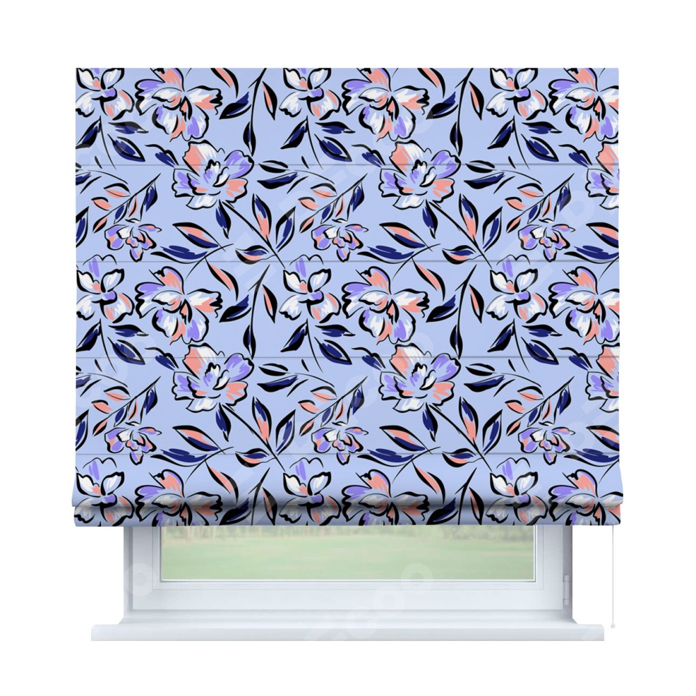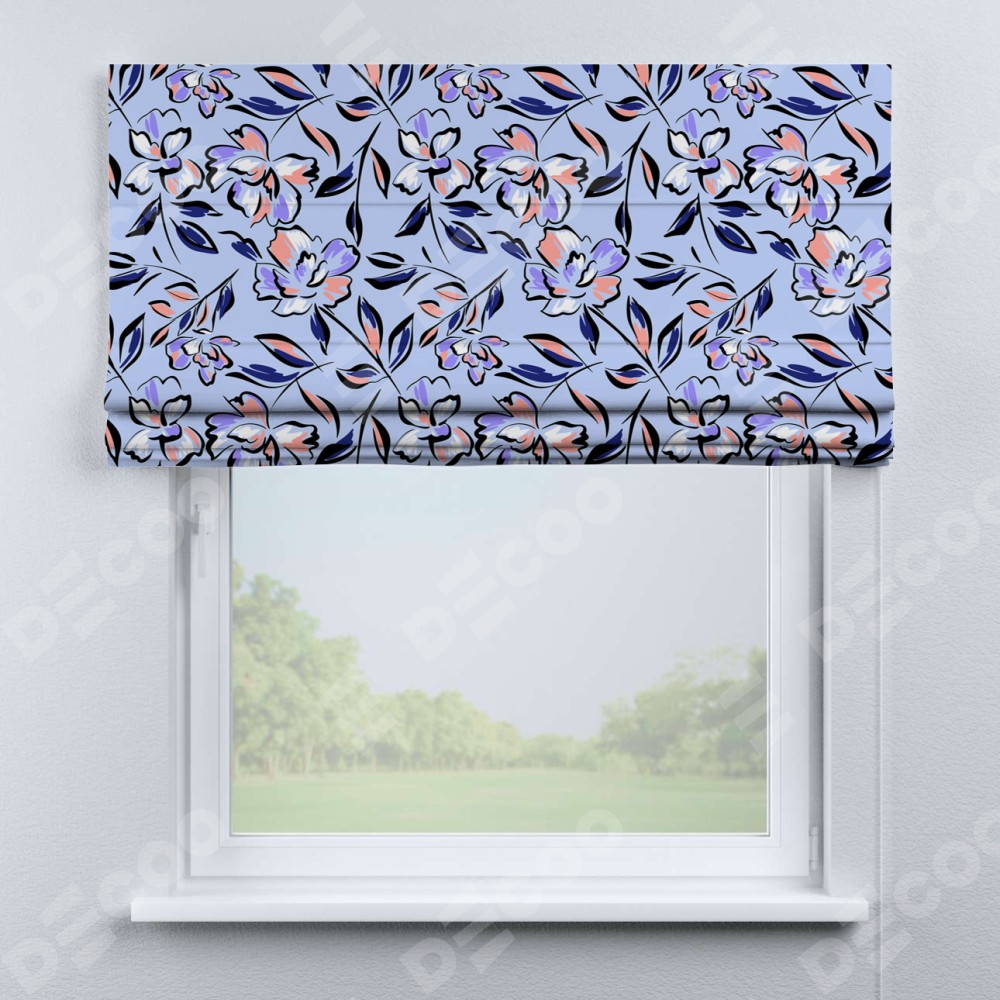Римская штора производителя «Cortin», используется для проёма, пошита из ткани блэкаут с нанесением сублимационной печати «Цветочки и листочки». Имеет универсальный механизм и подходит для монтажа: на потолок, на стену и в нишу.