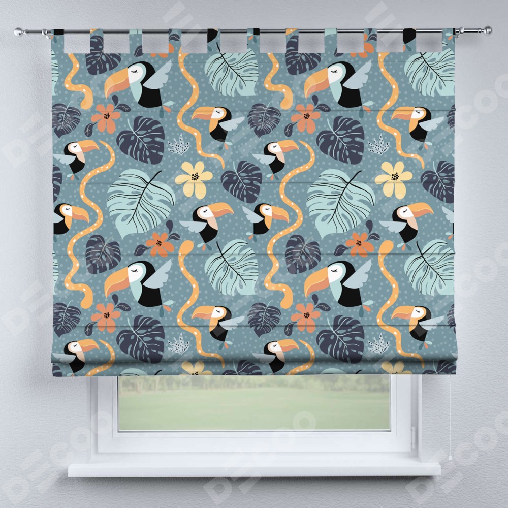 Римская штора производителя «Cortin», используется для проёма, пошита из ткани блэкаут с нанесением сублимационной печати «Экзотические птицы». Данная модель пошита на петлях, комплектуется на выбор круглым карнизом и подходит для монтажа на стену. Римская штора на петлях имеет простую систему регулировки высоты, отличительным преимуществом данной модели является простой способ монтажа. Достаточно повесить ее на трубу и штора готова!