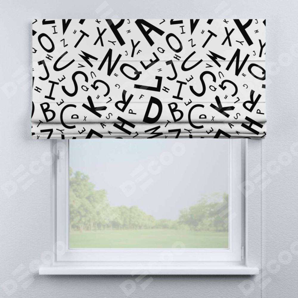 Римская штора производителя «Cortin», используется для проёма, пошита из ткани блэкаут с нанесением сублимационной печати «Литеры на белом». Имеет универсальный механизм и подходит для монтажа: на потолок, на стену и в нишу.