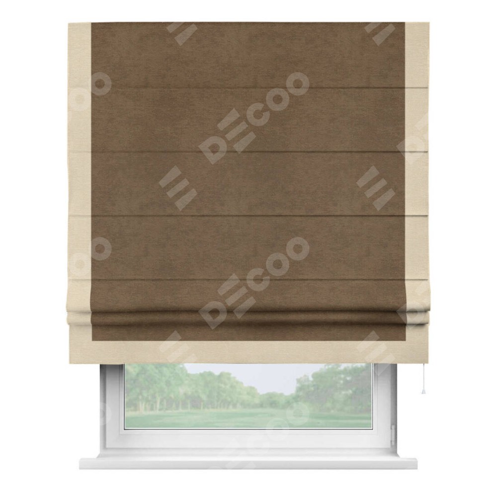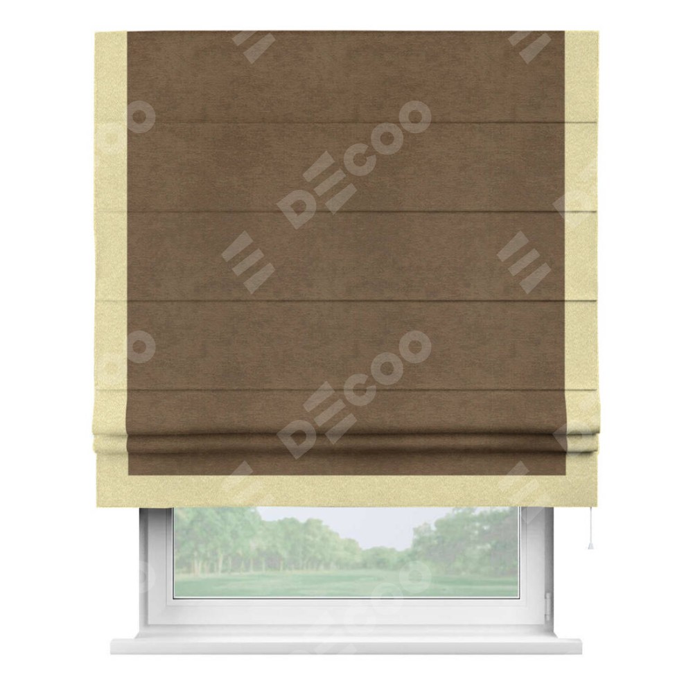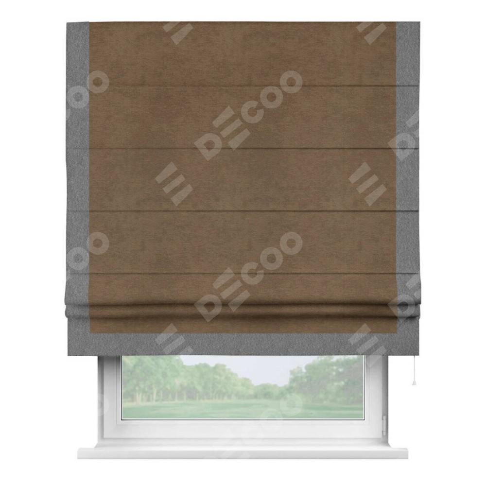 Римская штора производителя «Cortin», используется для проёма, пошита из ткани софт однотонный бронзовый, артикул 33099. Отделка шторы кантом «Виктория», ткань для канта используется из софта разной расцветки на выбор. Имеет универсальный механизм и подходит для монтажа: на потолок, на стену и в нишу.