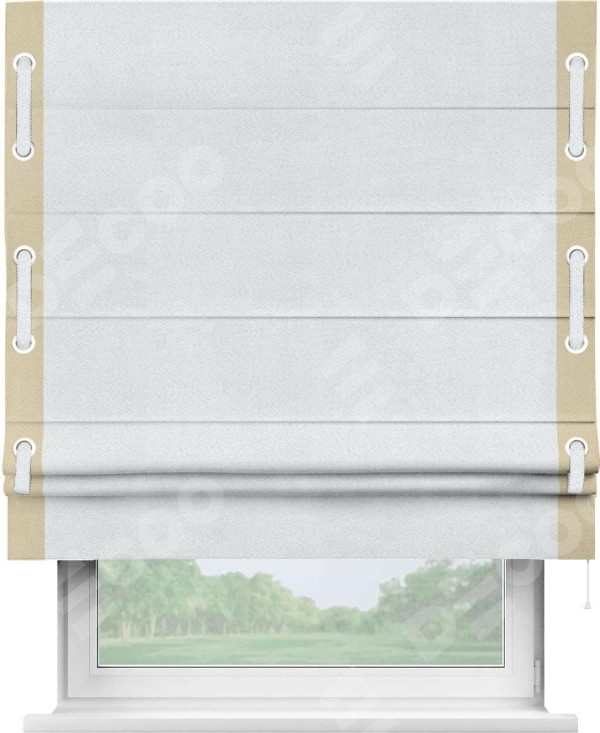 Римская штора производителя «Cortin», используется для проёма, пошита из ткани блэкаут однотонный дымчато-белый, артикул ткани 101. Отделка шторы кантом «Стрим Дуо» на кантах расположены люверсы с пояском, ткань для канта используется из блэкаута однотонного разной расцветки на выбор. Ткань для пояска обычно используется из основной ткани шторы, а так же можно сделать из любой расцветки по желанию. Имеет универсальный механизм и подходит для монтажа: на потолок, на стену и в нишу.