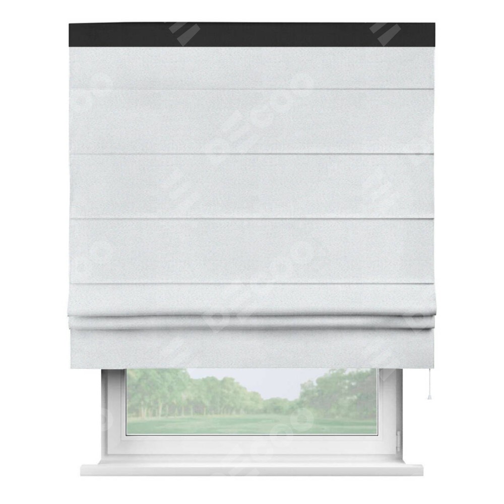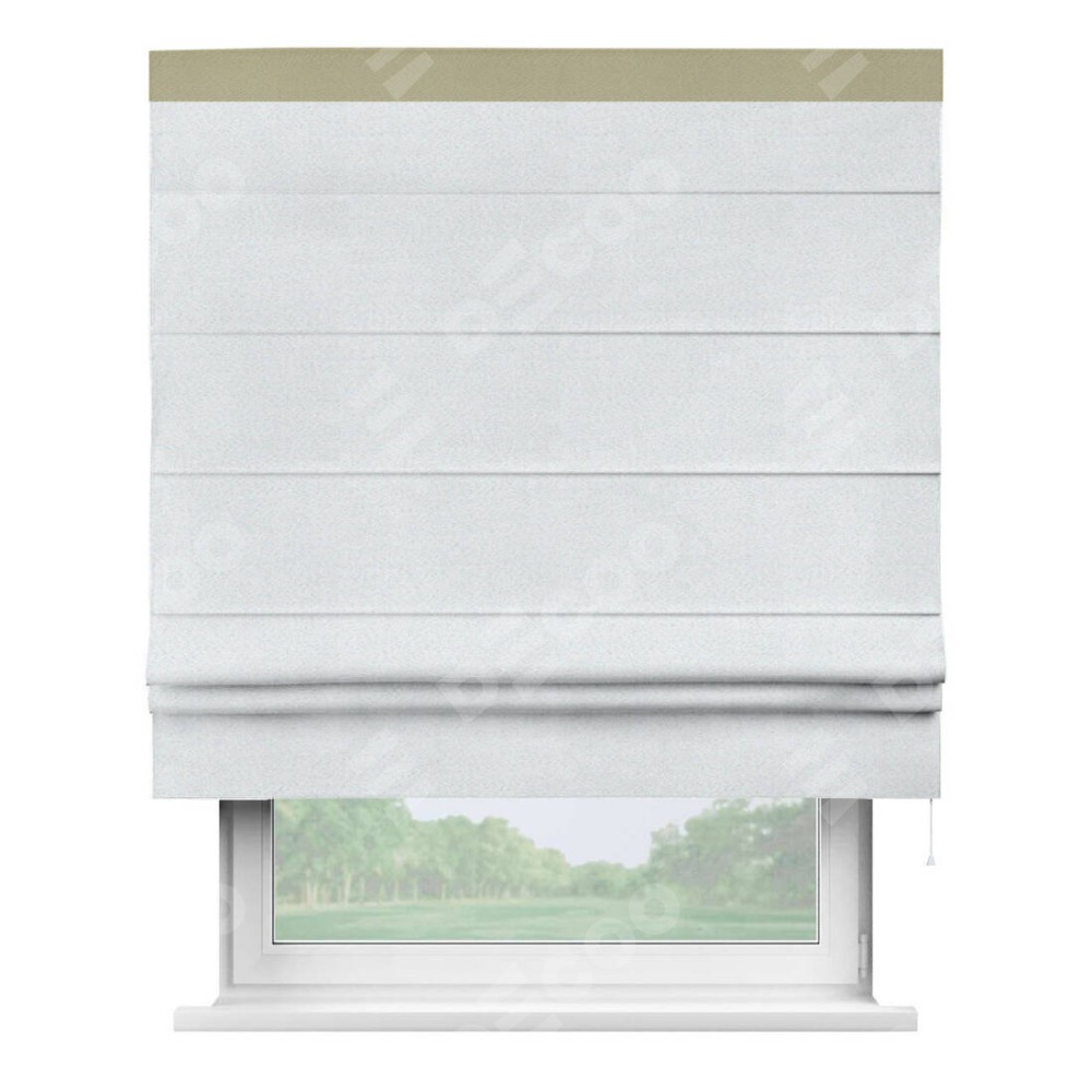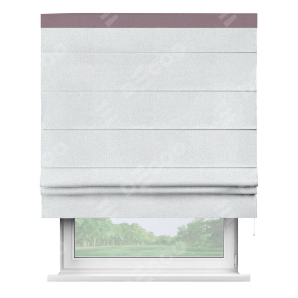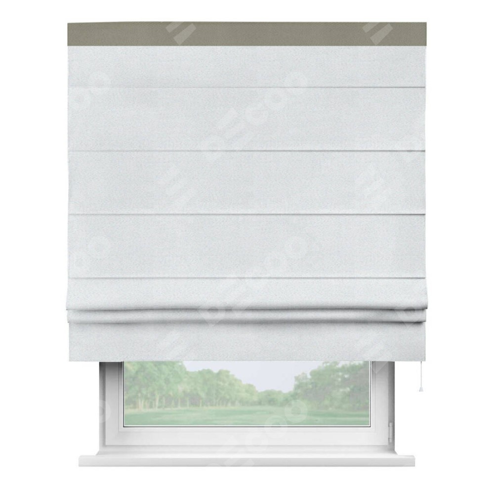 Римская штора производителя «Cortin», используется для проёма, пошита из ткани блэкаут однотонный дымчато-белый, артикул ткани 101. Отделка шторы кантом «Кинг», ткань для канта используется из блэкаута однотонного разной расцветки на выбор. Имеет универсальный механизм и подходит для монтажа: на потолок, на стену и в нишу.