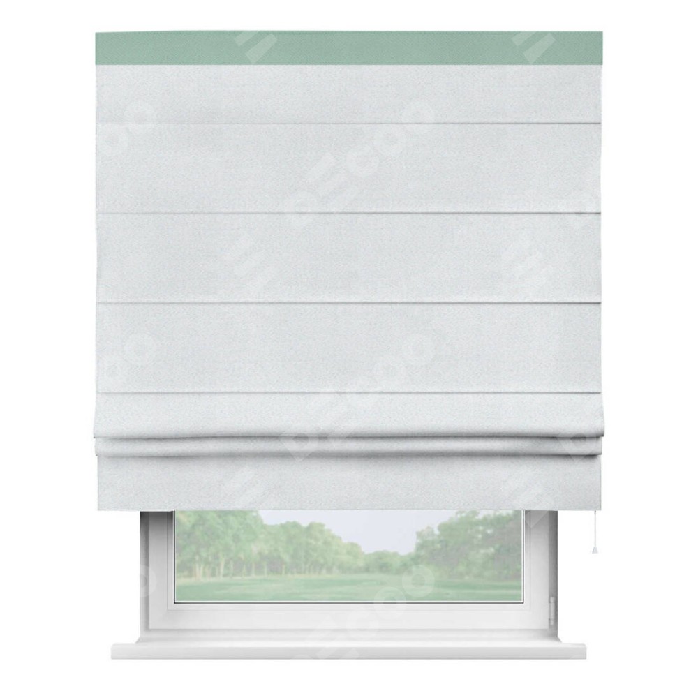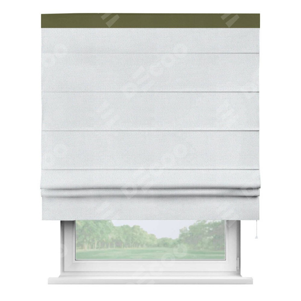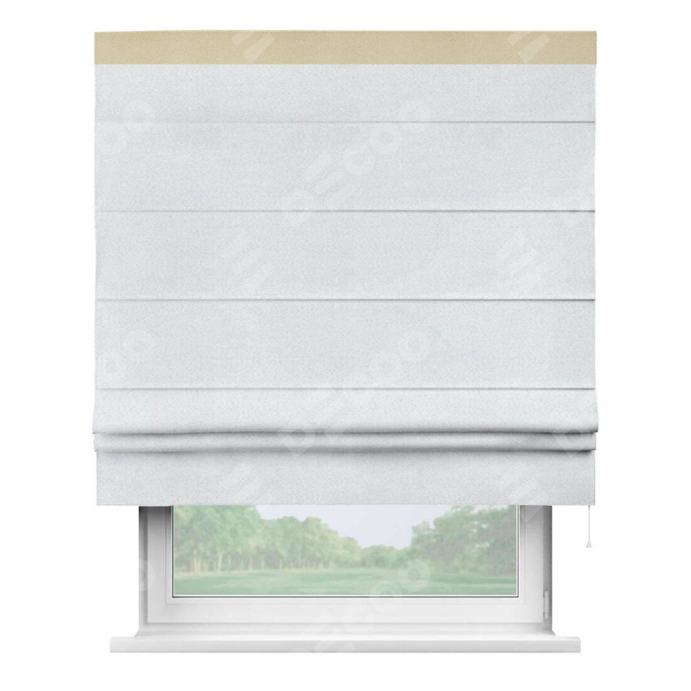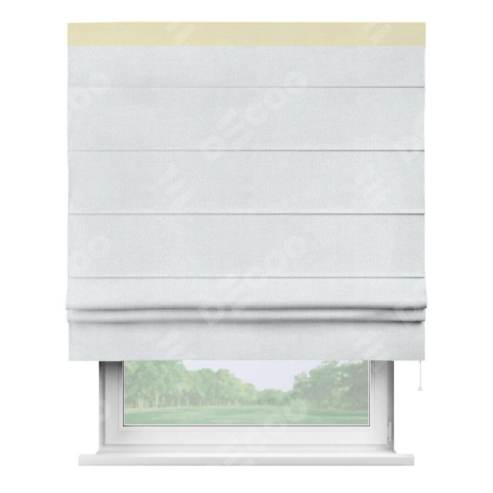 Римская штора производителя «Cortin», используется для проёма, пошита из ткани блэкаут однотонный дымчато-белый, артикул ткани 101. Отделка шторы кантом «Кинг», ткань для канта используется из блэкаута однотонного разной расцветки на выбор. Имеет универсальный механизм и подходит для монтажа: на потолок, на стену и в нишу.