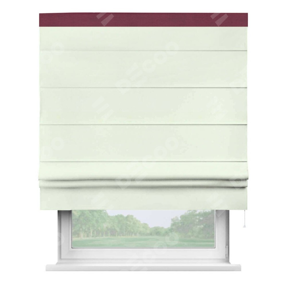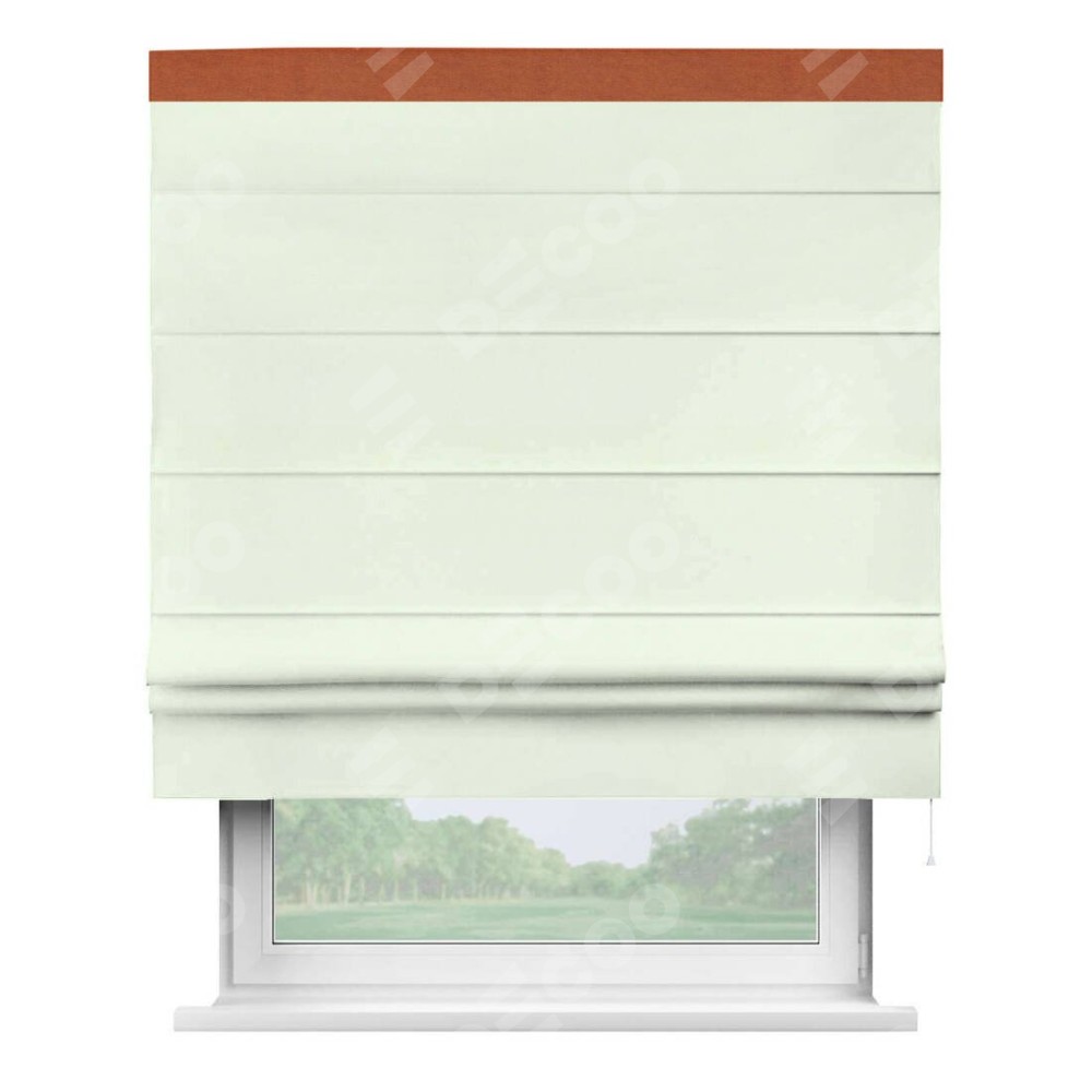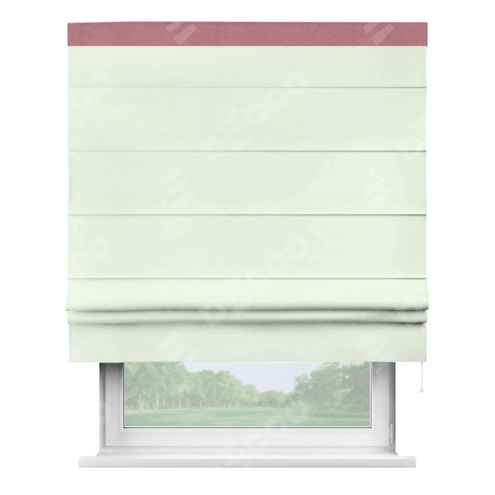 Римская штора производителя «Cortin», используется для проёма, пошита из ткани вельвет кремовый, артикул ткани 85524. Отделка шторы кантом «Кинг», ткань для канта используется из вельвета разной расцветки на выбор. Имеет универсальный механизм и подходит для монтажа: на потолок, на стену и в нишу.